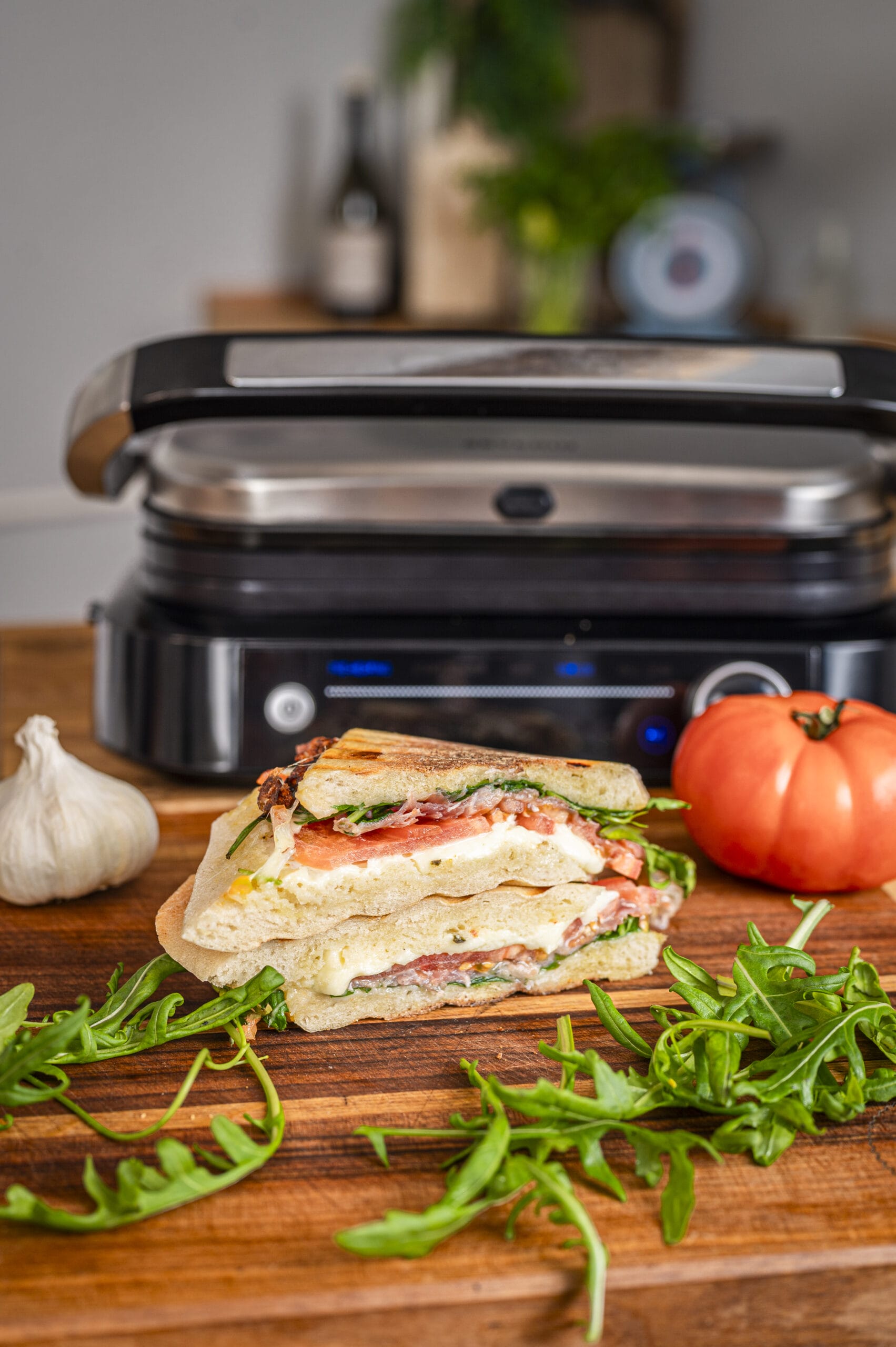 Diese rustikale Kombination aus Olivenöl, Tomaten, Schinken und Mozzarella ist schnell und einfach zubereitet. Sie schmeckt auch mit Thunfisch und Zwiebeln. Der Kontaktgrill ist ein praktischer Helfer für eine leckere Mahlzeit oder einen Snack zwischendurch. Guten Appetit!