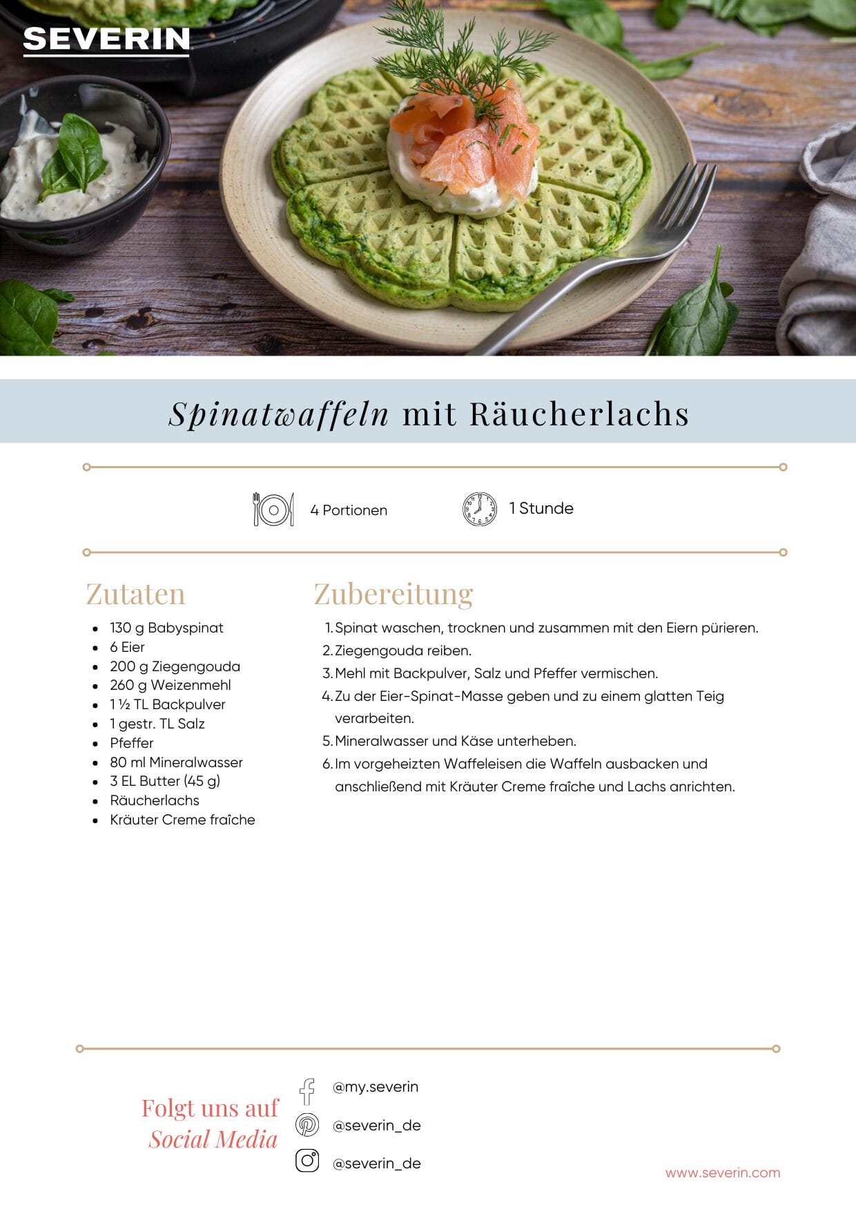 - Im vorgeheizten Waffeleisen die Waffeln ausbacken und anschließend mit Kräuter Creme fraîche und Lachs anrichten.