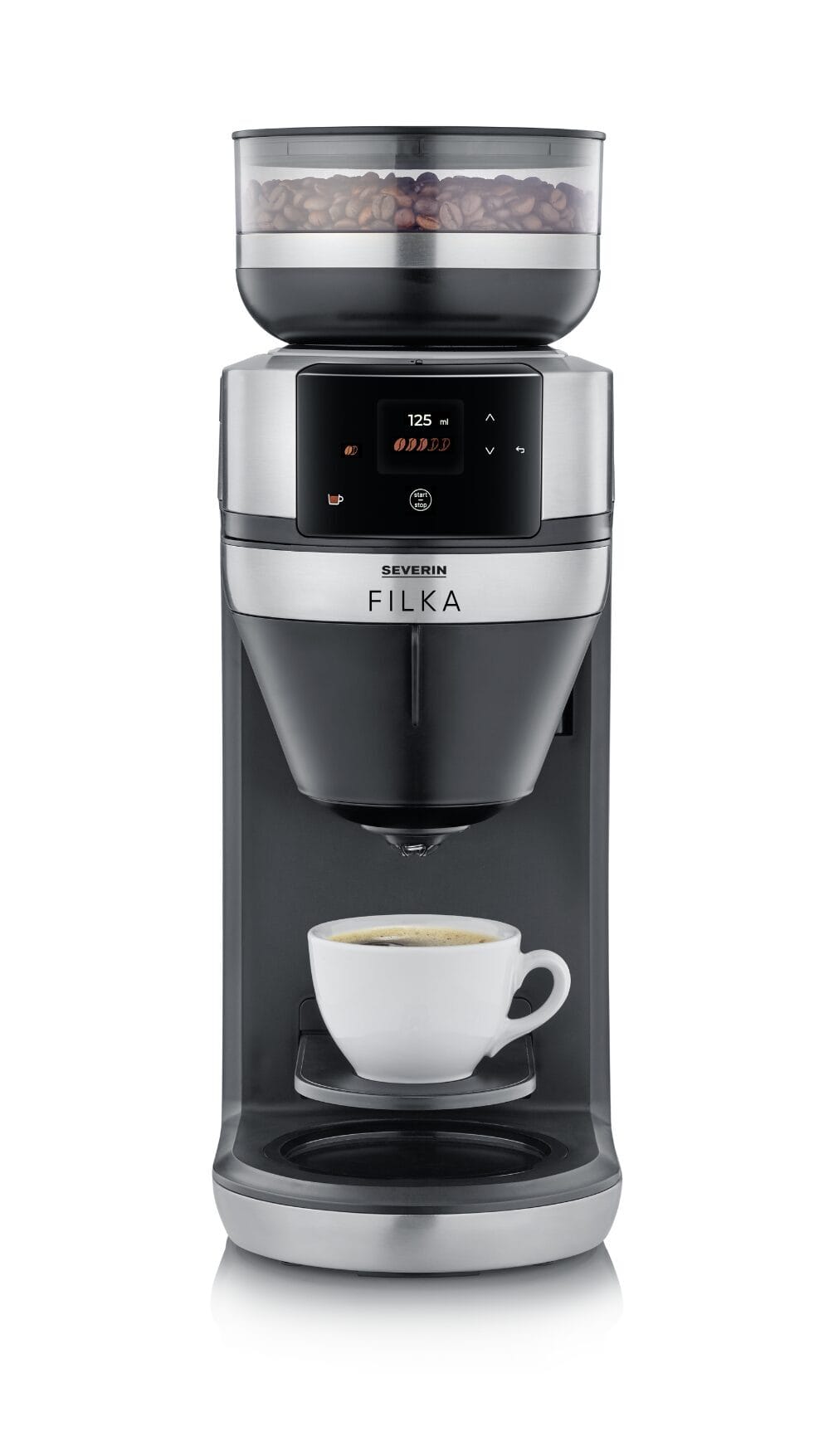 Der innovative Filterkaffee-Vollautomat FILKA von SEVERIN hat sich im Markt durchgesetzt: Ein einfacher Knopfdruck genügt, und die FILKA zaubert frisch gemahlenen, perfekt temperierten Kaffee in Premiumqualität in fünf unterschiedlichen Portionsgrößen – egal ob kleine oder mittlere Tasse, To-Go-Becher, Glas- oder Thermokanne.