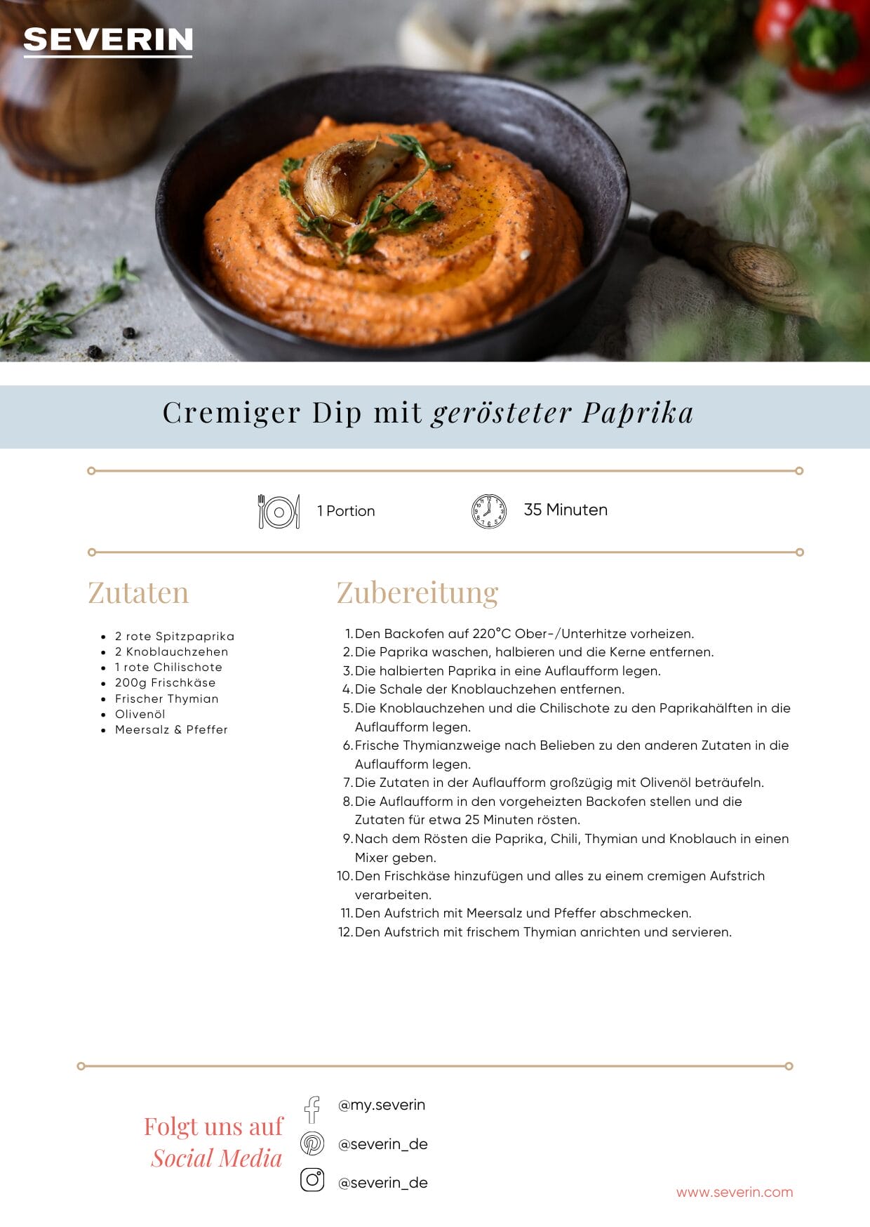 Gib deinem Grillabend eine besondere Note mit diesem köstlichen Aufstrich aus geröstetem Paprika und Frischkäse! Perfekt als Beilage zu gegrilltem Fleisch, Gemüse oder als Dip zu frischem Brot bringt dieser cremige Aufstrich eine herrlich rauchige und würzige Note auf den Tisch. Die Kombination aus gerösteten Paprikaschoten, aromatischem Knoblauch und einem Hauch Chili, verfeinert mit frischem Thymian und Frischkäse, macht ihn zum Highlight jeder Grillparty. Einfach in der Zubereitung und unglaublich lecker - dieser Aufstrich wird deine Gäste begeistern und jeden Grillabend verfeinern!