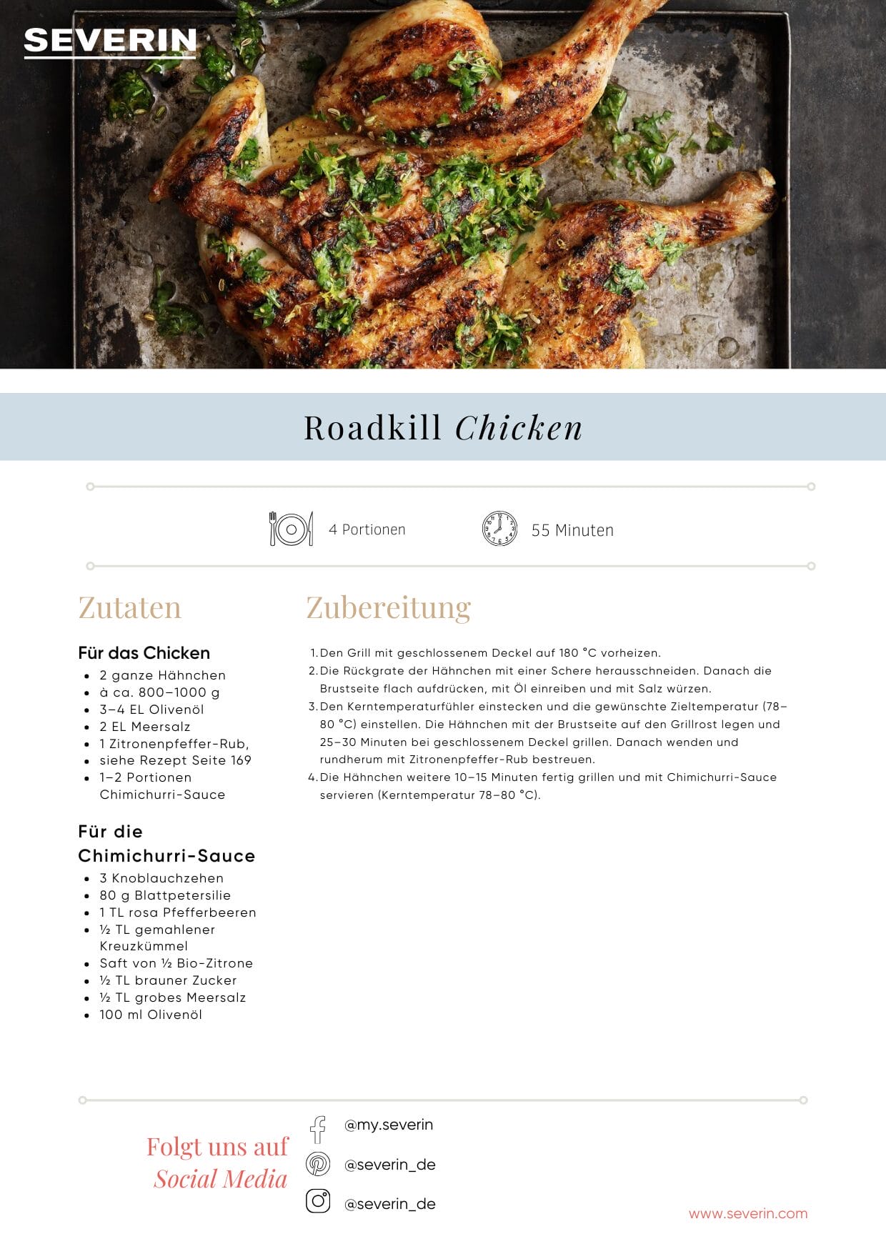 Das Roadkill Chicken ist eine besondere Zubereitungsart des Hähnchens, bei der dieses flach auf den Grill gelegt wird. Daher kommt auch der Name, da es wie überfahren aussieht. Eingerieben mit einem Zitronenpfeffer-Rub und mit einer Chimichurri-Sauce schmeckt es fruchtig und pikant. Enjoy!