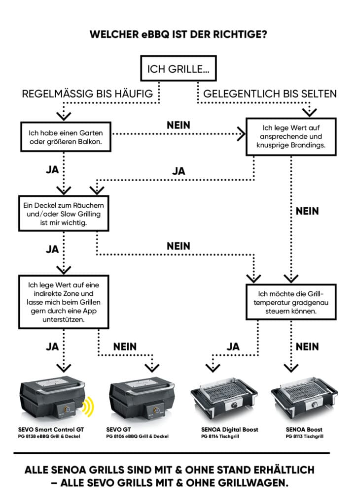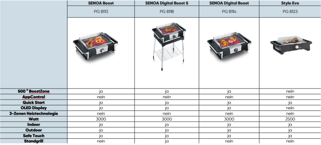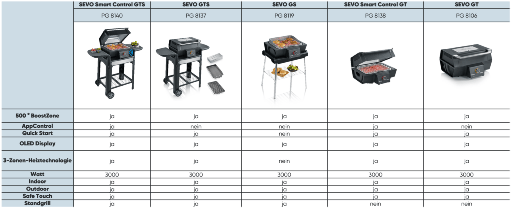 Da die Suche und vor allem die Auswahl eines Elektrogrills nicht gerade einfach ist, gibt es von uns heute eine hilfreiche Übersicht. Hier seht ihr auf einen Blick unsere verschiedenen SEVERIN Elektrogrills und könnt sie gut vergleichen. Wir haben für jeden Wunsch den passenden Grill und auch mit wenig Platz zu Hause, werdet ihr hier sicher fündig. Die meisten unserer Elektrogrills eignen sich sowohl für drinnen als auch für draußen, somit sind sie perfekt geeignet für alle, die auch im Winter und bei schlechtem Wetter nicht auf leckere Grillabende verzichten wollen. Außerdem erwarten euch tolle Features wie die App-Kontrolle oder auch unsere QuickStart-Technologie.