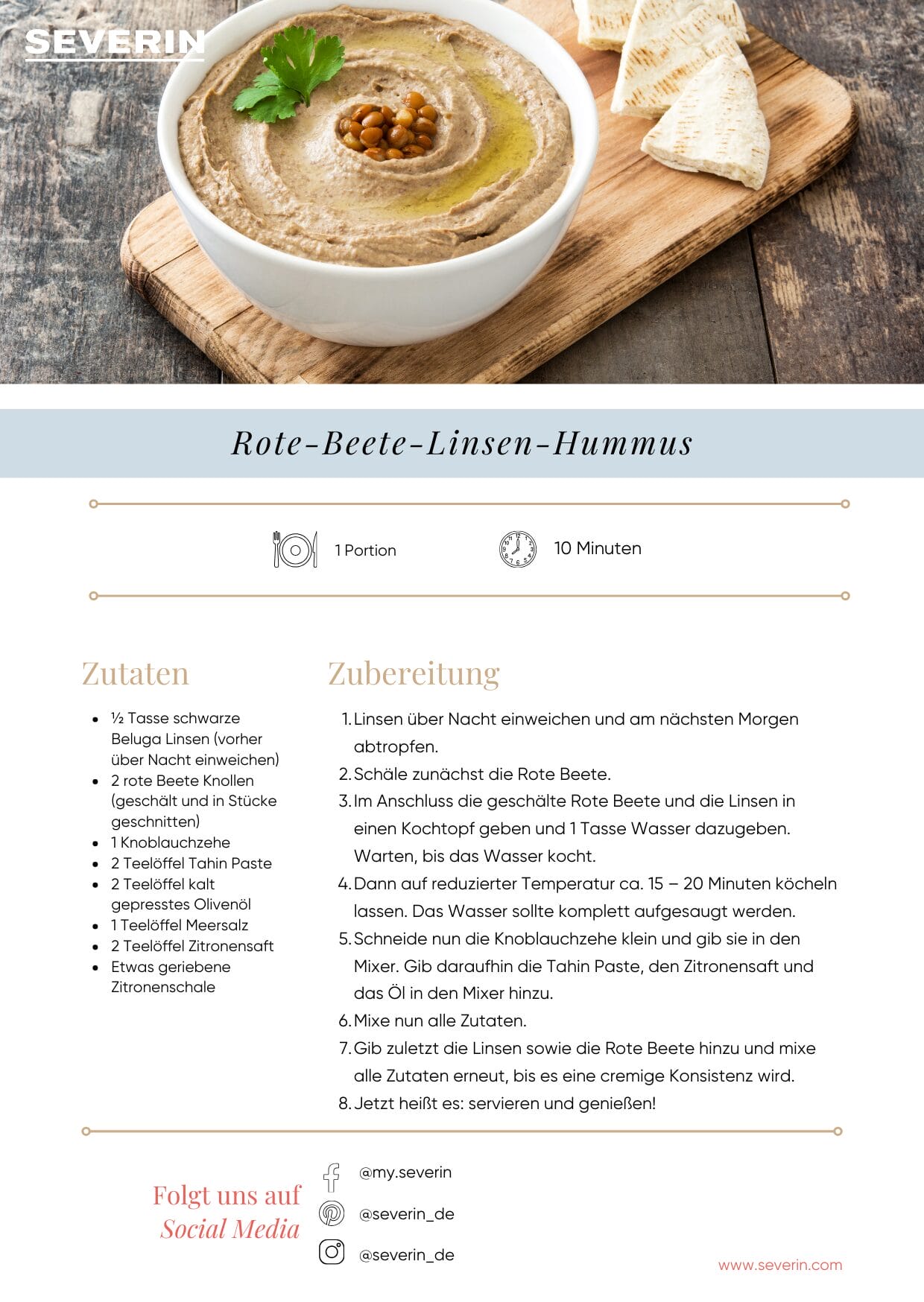 - Gib zuletzt die Linsen sowie die Rote Beete hinzu und mixe alle Zutaten erneut, bis es eine cremige Konsistenz wird.