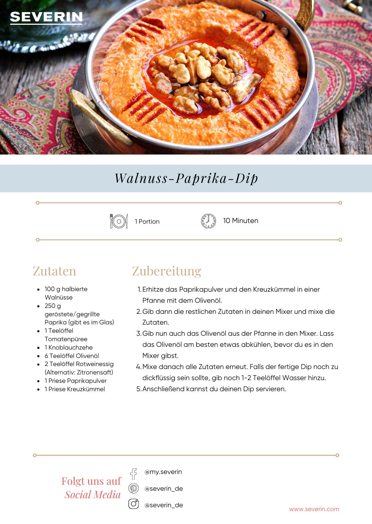 Walnüsse sind echt Alleskönner. Sie sind nicht nur gesund und gut für den Körper, sondern man kann mit ihnen auch viele leckere Gerichte zaubern. Wie z.B. Dips für Nachos, Brot oder Gemüsesticks. Gemeinsam mit Paprika und ein paar weiteren Zutaten, optimal für den nächsten Abend mit Freunden und/oder Familie.