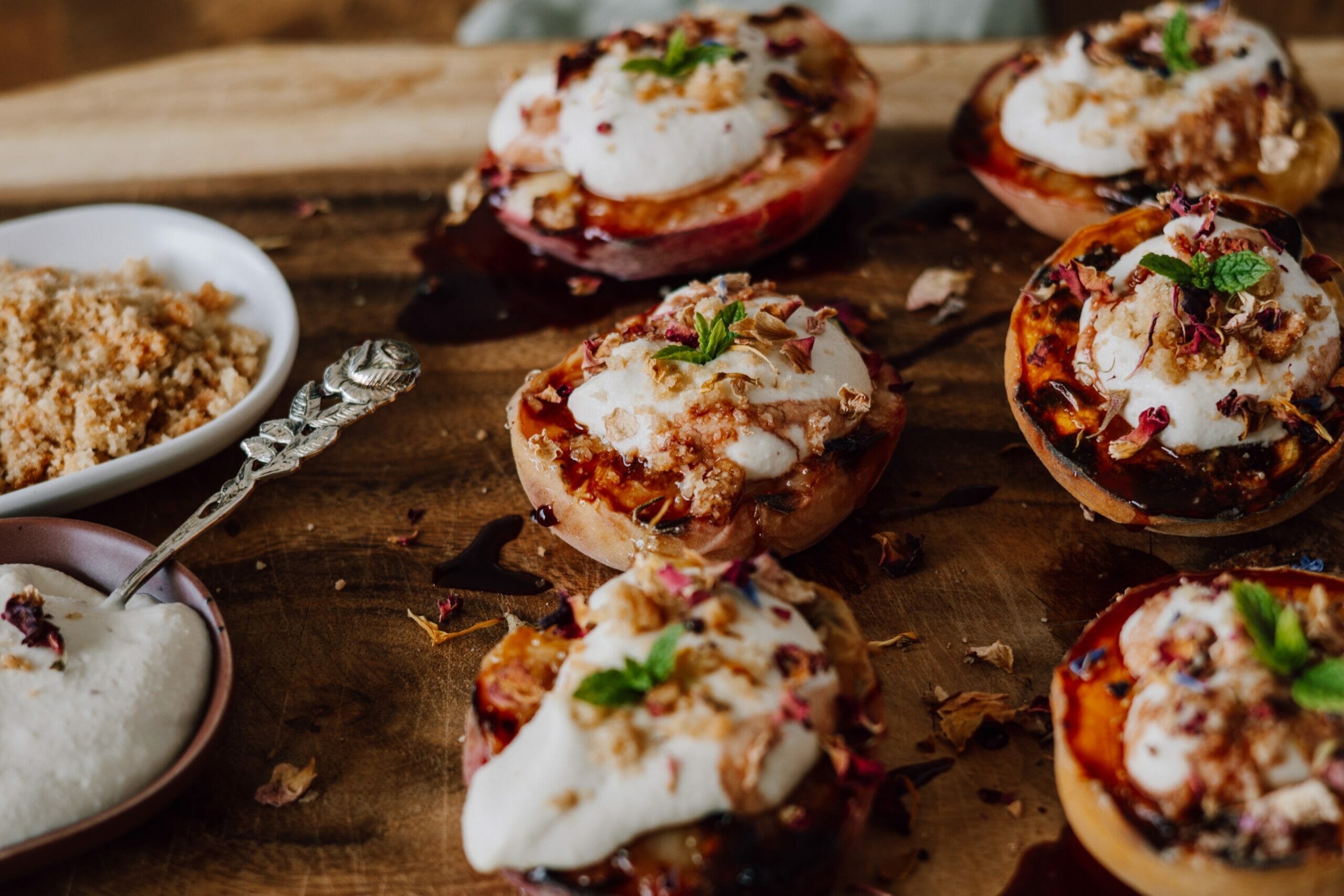 - Pfirsiche mit dem Cashew-Soja-Quark & den Toppings belegen und genießen!
