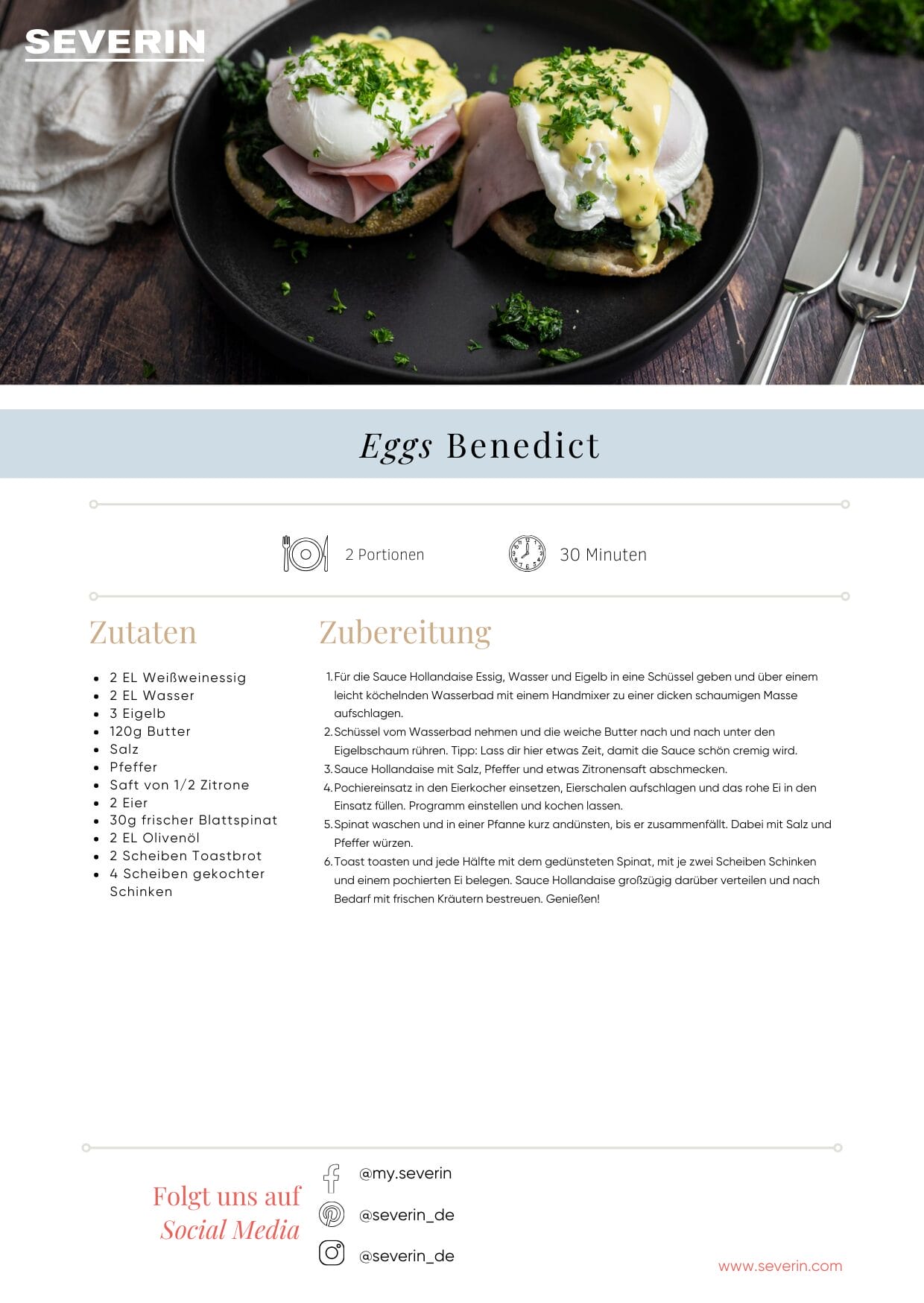 Eggs Benedict oder auch Eier Benedikt kommen ursprünglich aus Amerika. Doch auch auf den anderen Kontinenten haben die pochierten Eier auf Toast Zuspruch gefunden. Auch wenn der Klassiker eher zu den üppigen Speisen am Morgen gehört, ist er international sehr beliebt! Mittlerweile gibt es viele verschiedene Rezept-Varianten: Vegetarisch, mit Avocado oder auch mit Lachs statt Schinken. Auch genannt: Eggs Hemingway, Eggs Florentine oder auch Eggs Blackstone. Egal welche Variante ihr zubereitet, es ist eine schöne Alternative zu gekochten Eiern und mit einem Eierkocher sehr leicht umzusetzen. Ach und unsere Eggs Benedict haben wir mit selbstgemachter Sauce Hollandaise zubereitet. Wir zeigen dir auch hier, wie einfach das ist.