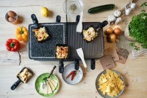 Das Praktische dabei: Du musst Dich nicht zwischen Raclette oder Fondue entscheiden und kannst Deinen Gästen beides bieten. Außerdem kannst Du viele Lebensmittel wie Gemüse oder Fleisch unterschiedlich (z.B. im Brühe-Fondue, auf der Grillfläche oder im Anschluss noch in den Pfännchen mit Käse überbacken) zubereiten und bietest so noch mehr Vielfalt ohne großen Aufwand.