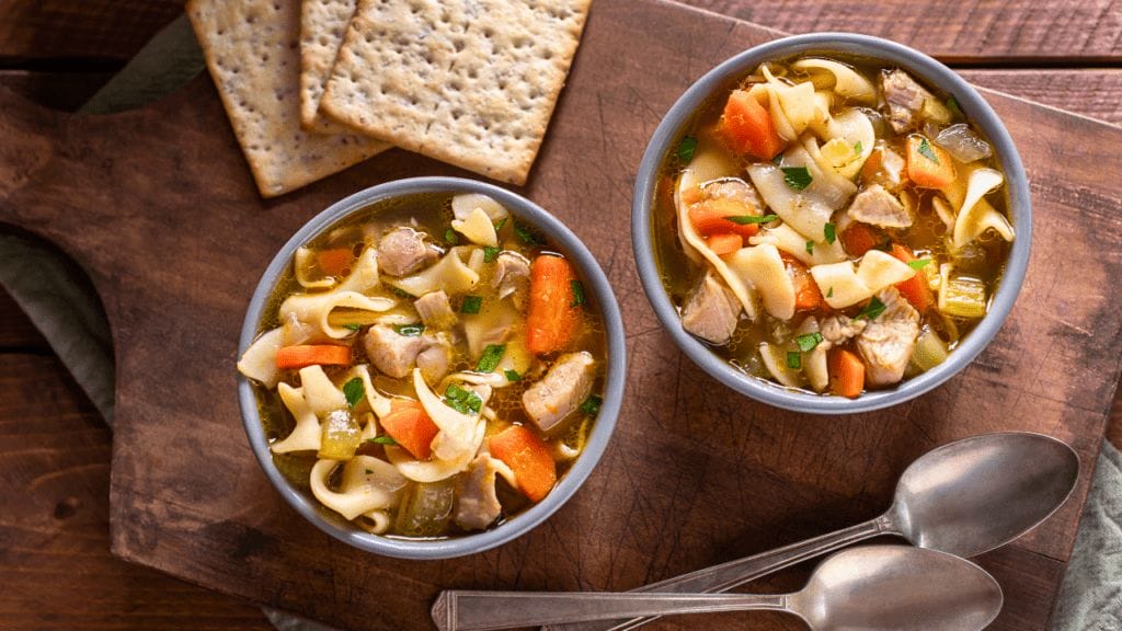 Manchmal braucht man eine warme, beruhigende Suppe, um den Kater zu vertreiben. Unsere Kater-Nudelsuppe kombiniert Hühnerbrühe, Eiernudeln, zartes Hühnerfleisch, Gemüse und einen Hauch Sojasauce zu einer köstlichen, belebenden Mahlzeit.