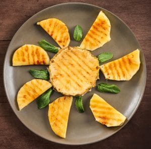 - Die Ananasviertel mit der Schale nach unten auf den heißen eBBQ-Grill legen und mit der Honig-Senf-Marinade bestreichen. In den kommenden 15-20 Min. die Ananas immer wieder mit der Honig-Senf-Marinade bestreichen. Vom Grill runternehmen und genießen!
