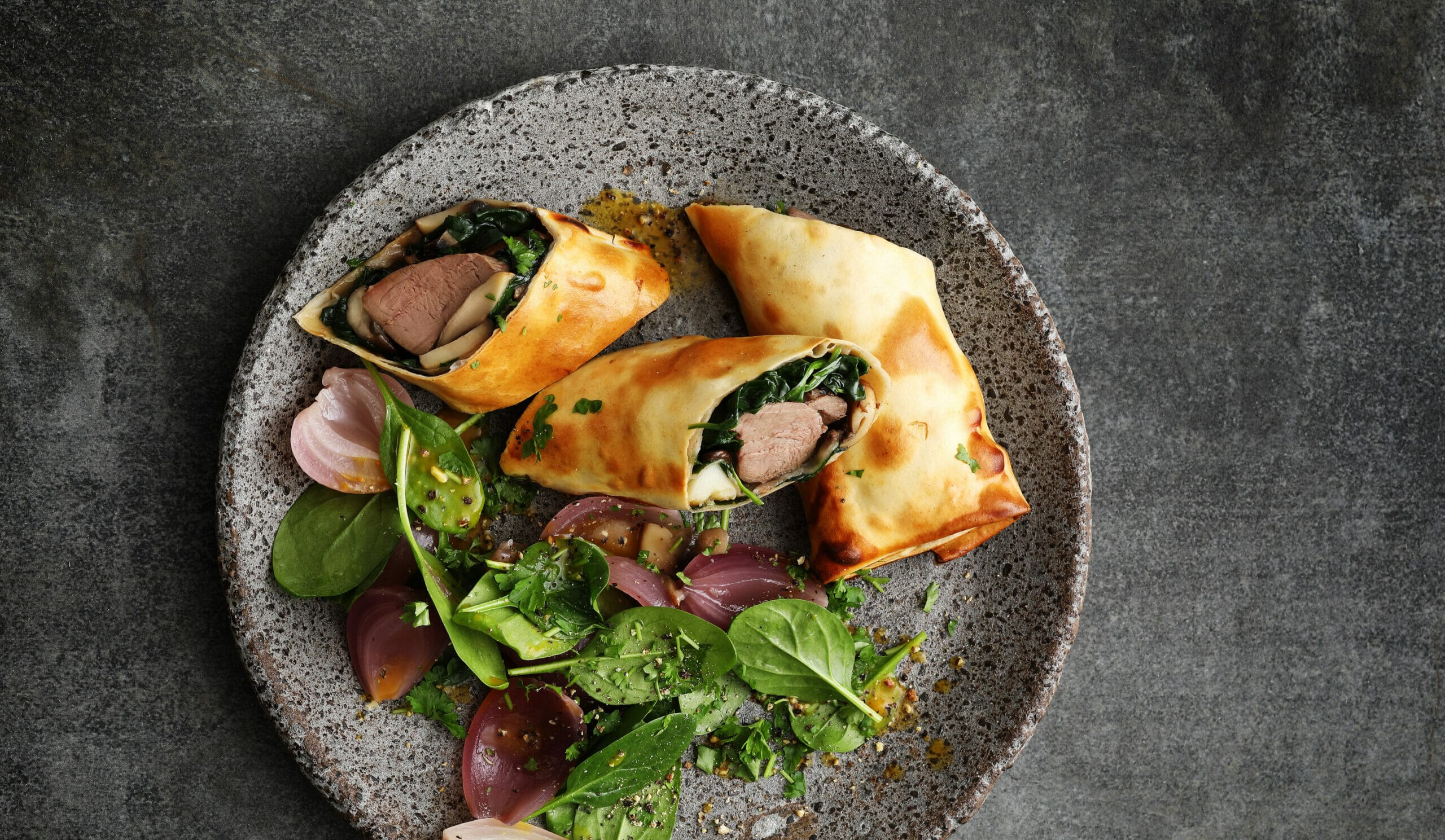 - Den Strudelteig nebeneinander auflegen. Den Champignon-Spinat jeweils am unteren Ende verteilen und die Filets darauflegen. Eigelb und Milch miteinander verrühren.