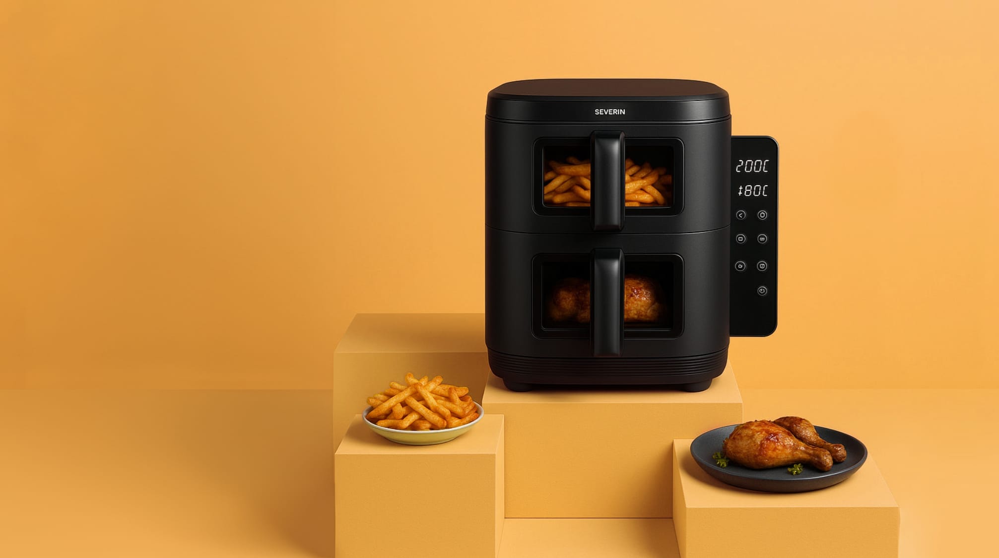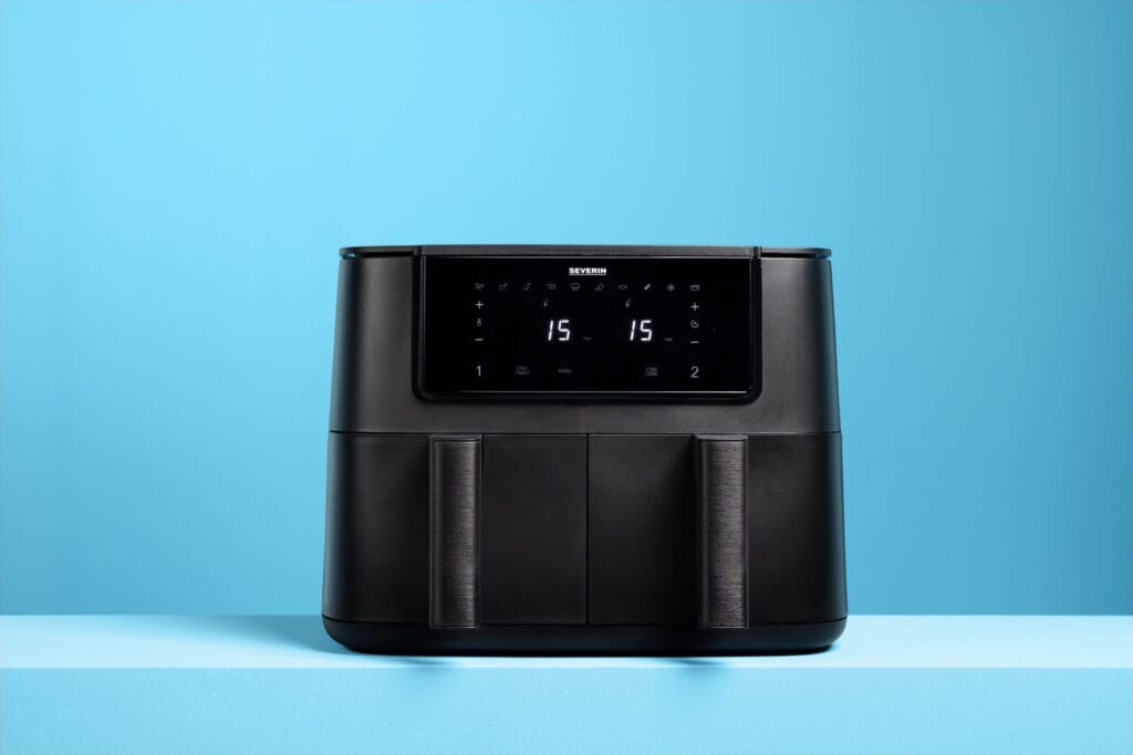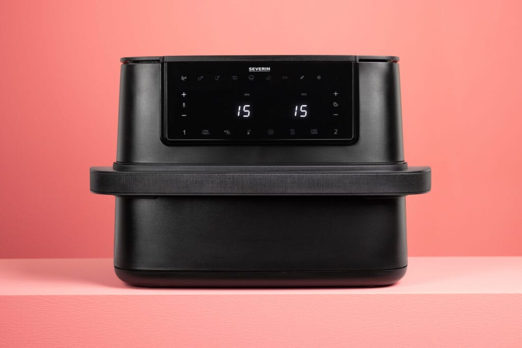 Die Severin Heißluftfritteuse Black Line Dual ist perfekt für stressfreies Kochen, wenn du mehrere Komponenten gleichzeitig servieren willst – zum Beispiel Pommes und Gemüse oder Hähnchen und Beilage.