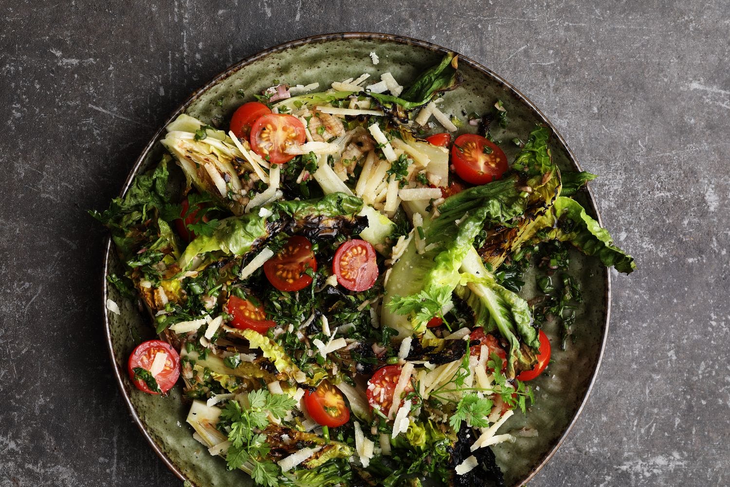 - Place the grilled lettuce hearts on a platter, season with the vinaigrette and top with tomatoes and parmesan.