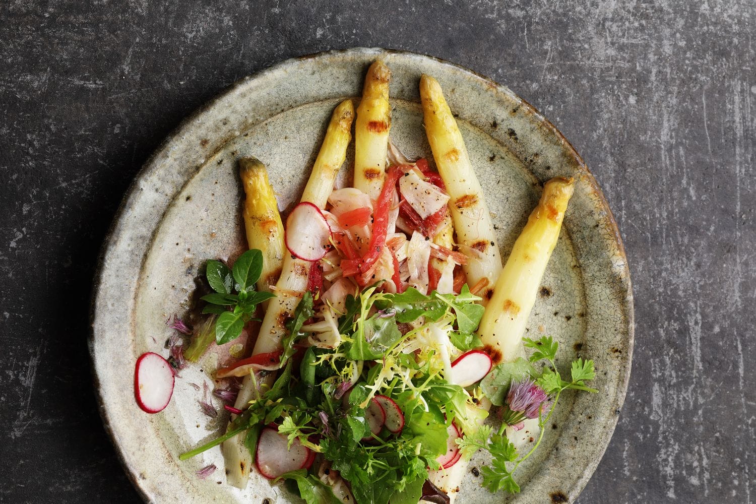 Grilled asparagus with rhubarb and fennel and wild herb salad