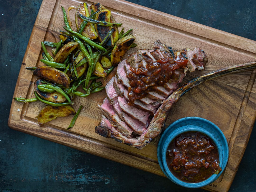 Grilled tomahawk ribeye with spicy barbecue relish