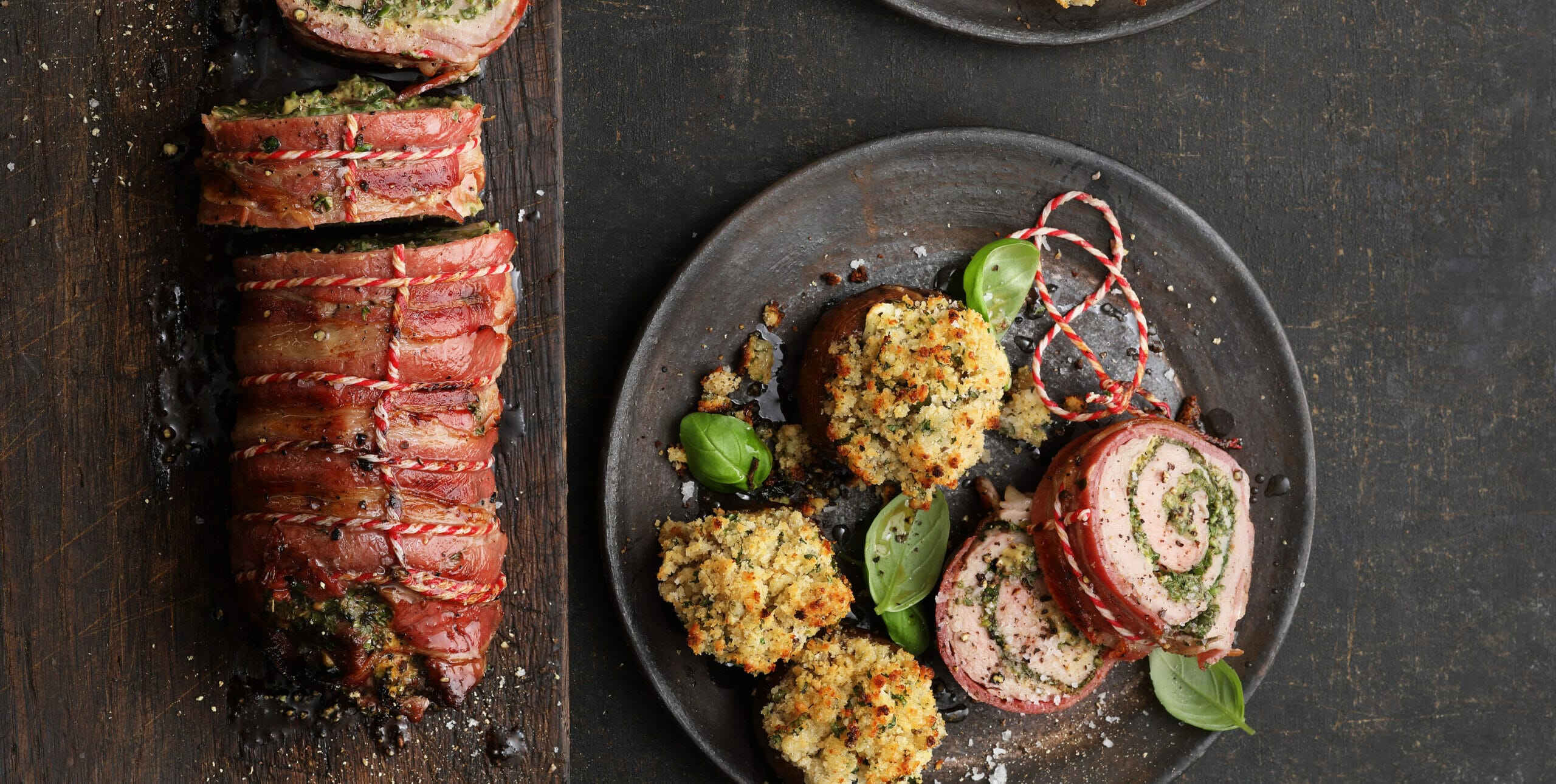 Rolled veal fillet wrapped in bacon with stuffed mushrooms