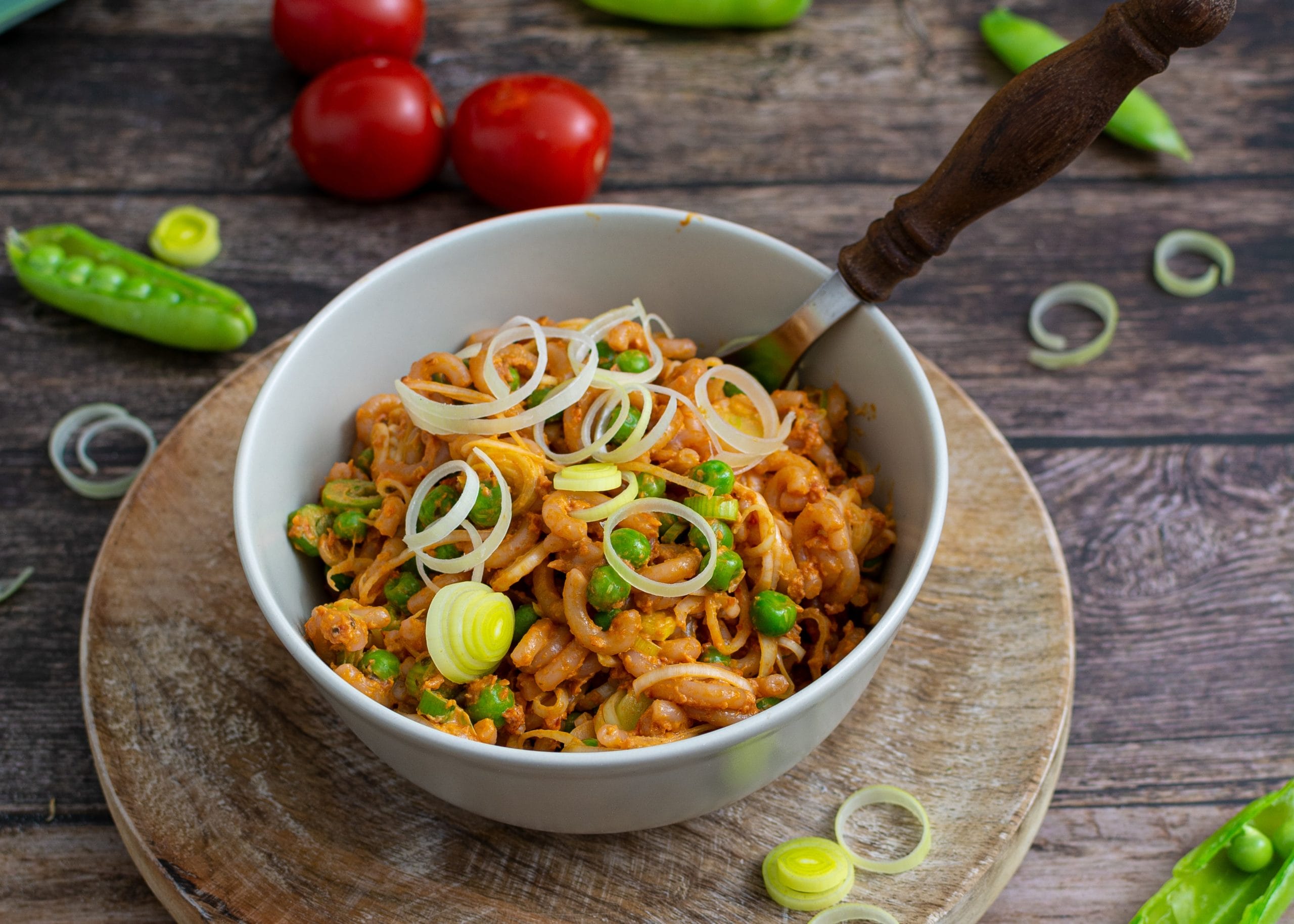 The classic pasta salad: pasta, mayo, cucumber, egg and sausage. Super tasty, but not for everyone. Today we have a super tasty pasta salad with pesto and some greens that almost everyone can enjoy. Quick and easy, it's not only a delicious meal, but also makes a great side dish for the next barbecue. Add the pesto. Ready. Let's go.