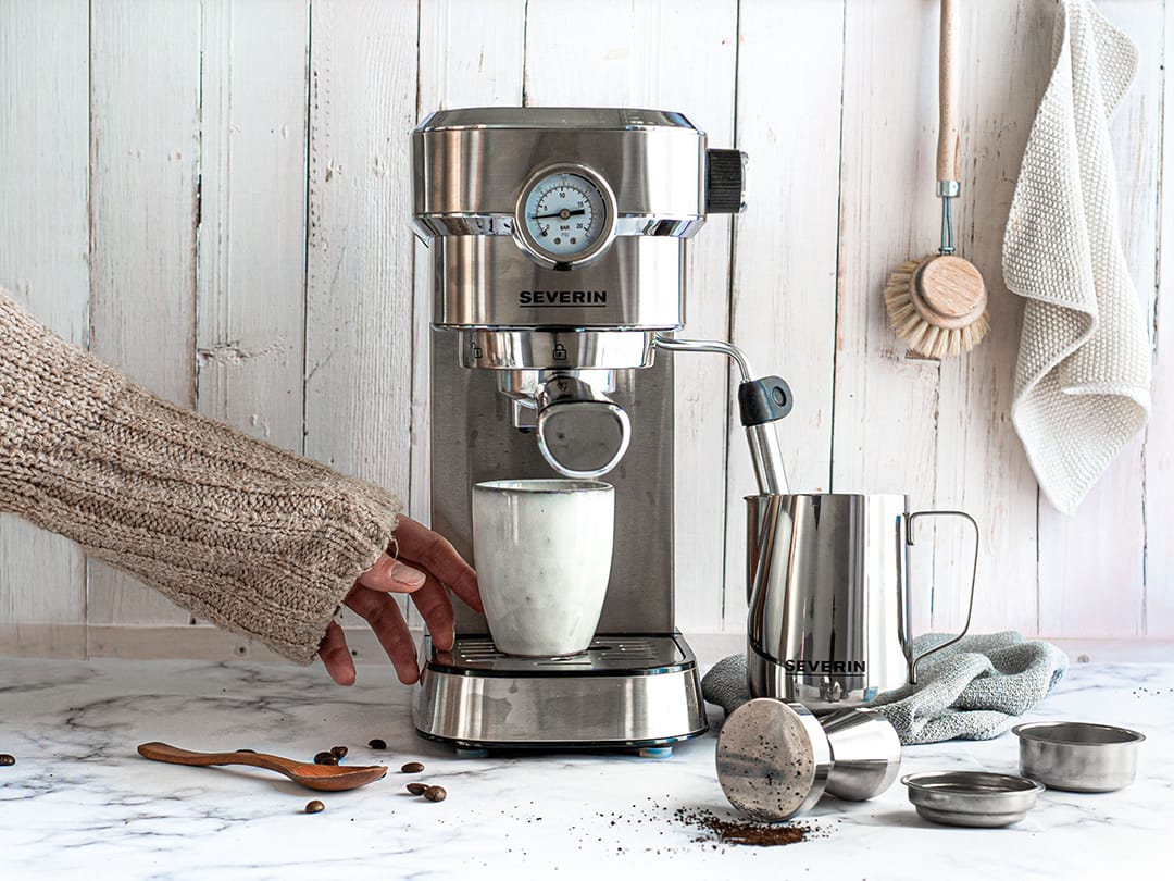 An espresso, please! Coffee culture has now also arrived here. Small cafés are springing up like mushrooms and coffee roasters have their hands full. No wonder. Because a few freshly ground beans and a fragrant coffee simply make the hearts of coffee lovers beat faster. And you don't even have to go to a coffee bar anymore. You can also make your own delicious coffee from your favorite coffee bean at home. Just like in a good coffee bar. The SEVERIN Espresa Plus portafilter machine brings the pleasure of coffee directly into your coffee cup at home.