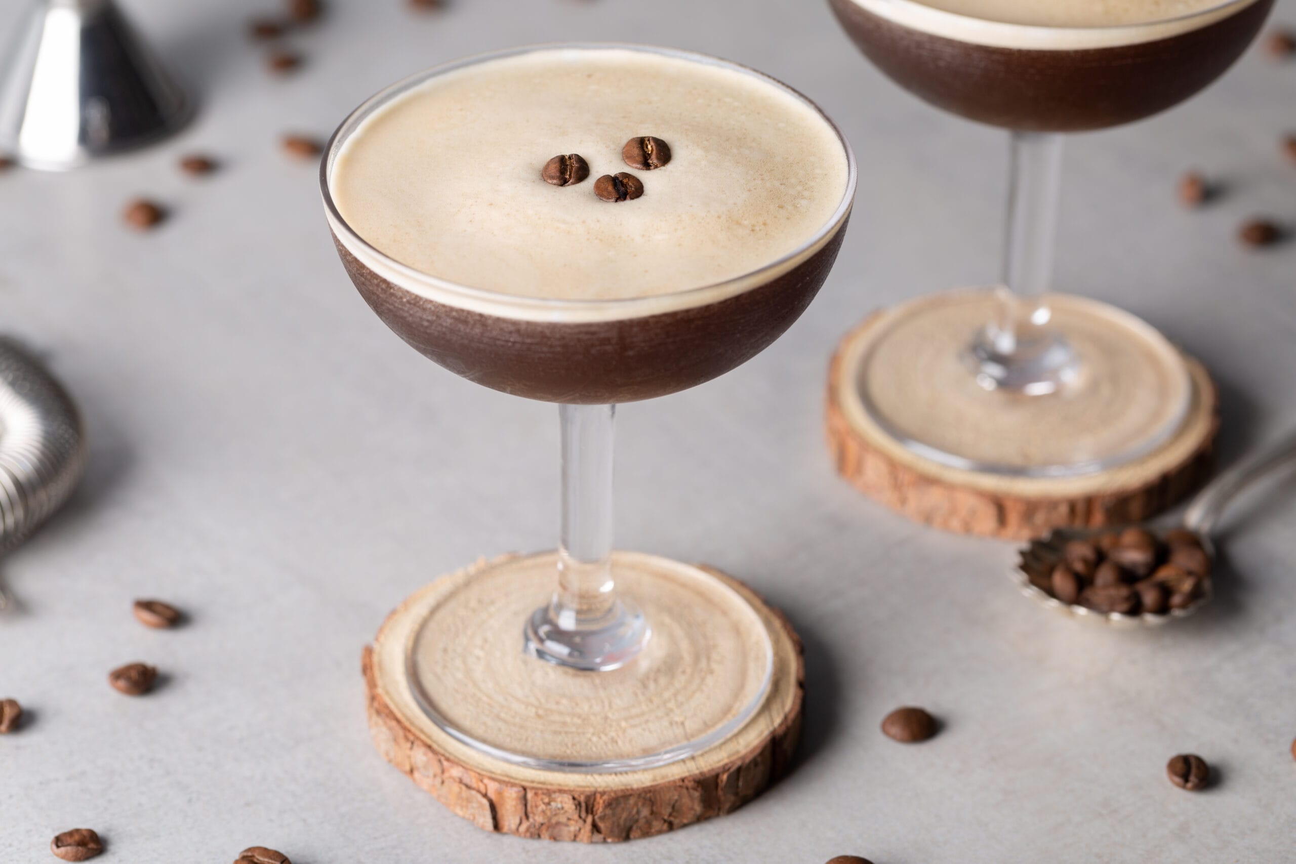 - Pour the drink into a martini glass, garnish with the coffee beans and serve.