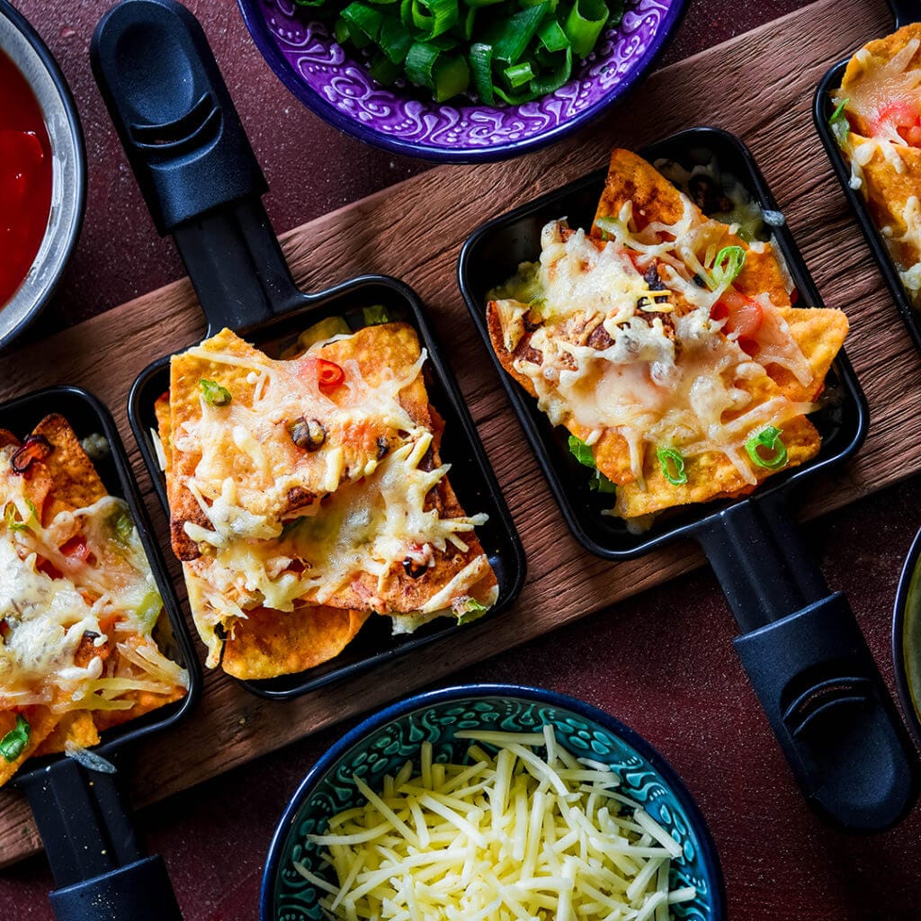 Snacks are always good. Did you know that you can also eat raclette? Our spicy cheese nachos show just how delicious this can be. With spring onions, lots of cheese and jalapeños or peppers, they are a delicious treat.