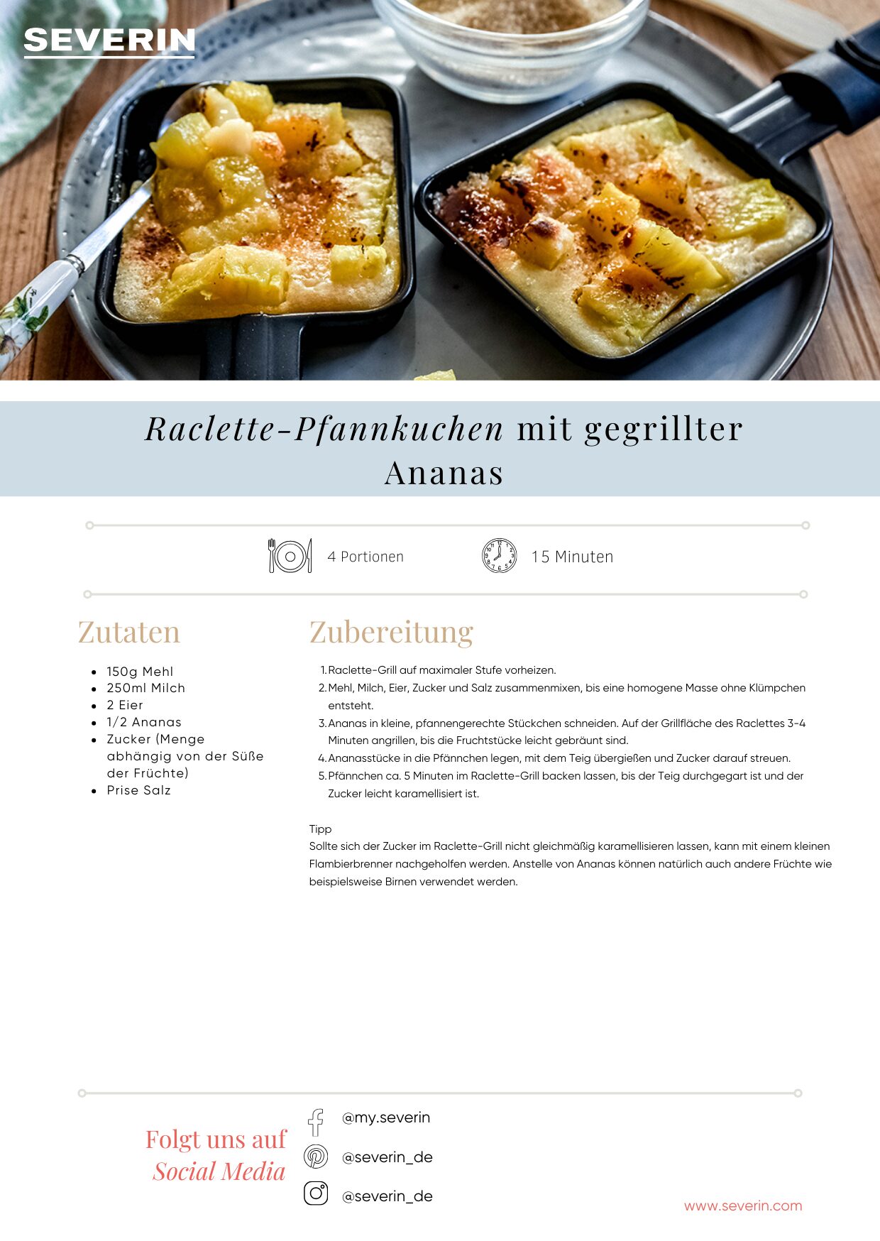 The raclette grill is perfect for this sweet temptation: first grill the pineapple pieces on the grill plate, then pour the sweet pancake batter over them and bake them in a small pan. It could hardly be more practical.