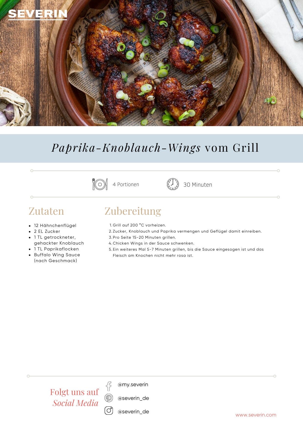 With this recipe for chicken wings, another American BBQ classic finds its way into our recipe collection. With a delicious paprika and garlic rub, it tastes great for young and old alike and is a great dish for the next family barbecue. Try it out for yourself and discover the great taste of this delicious finger food from the barbecue.