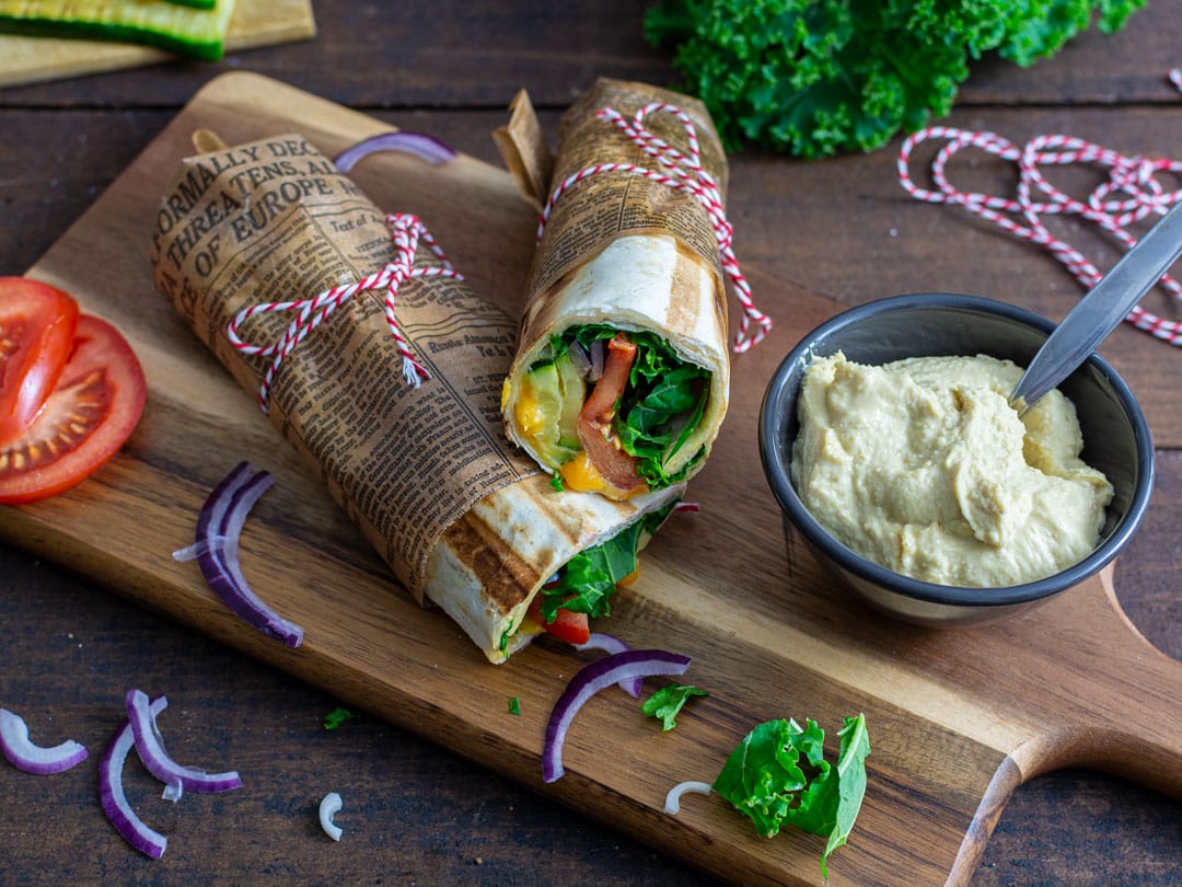 - Spread 2 tbsp of hummus on the tortillas. Top with a slice of cheese, zucchini slices, ½ cup of kale, onion and tomato slices. Then roll up the tortillas well and grill until you can see grill marks.
