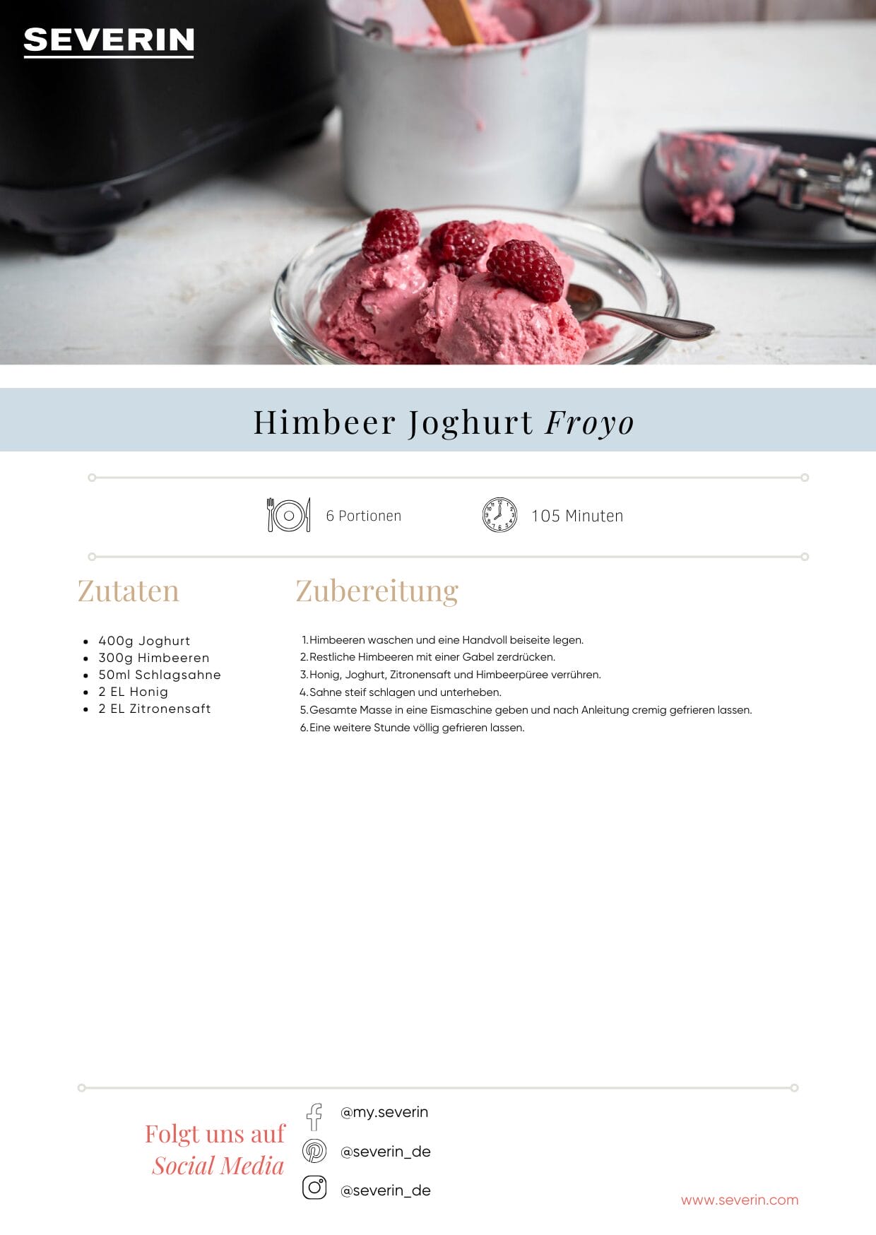 Frozen yoghurt, or FroYo for short, has become a real trend over the past summer. Yoghurt is used instead of cream, which is why FroYo has fewer calories than normal ice cream, but still tastes absolutely delicious. The raspberries also ensure a sufficient supply of vitamins - what more could you want?