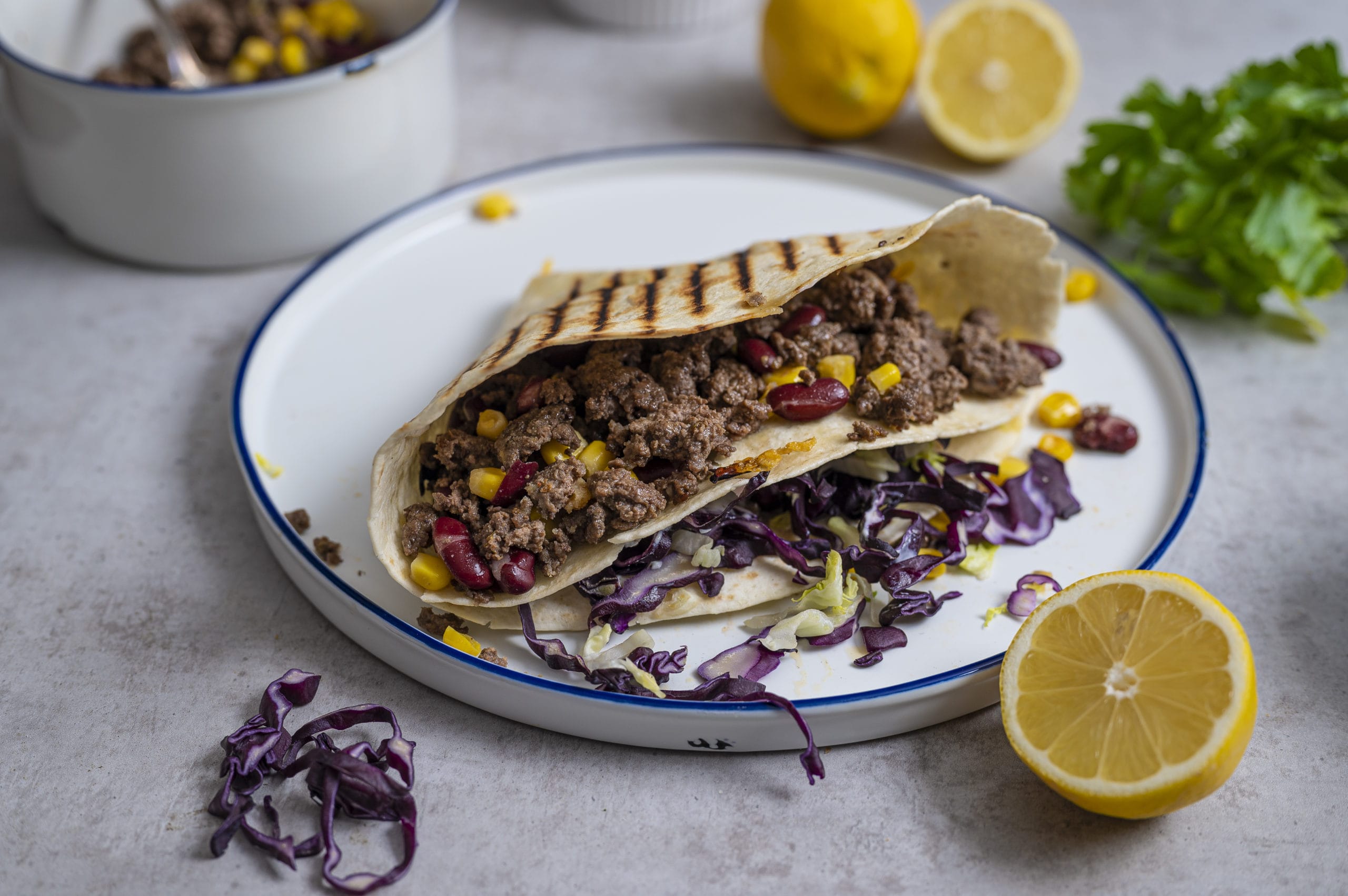 - Then, starting from the cut line, mentally divide the wrap into 4 equal sections and start topping. I recommend: Chili con carne, sour cream, red cabbage and cheddar. This can be adapted individually.