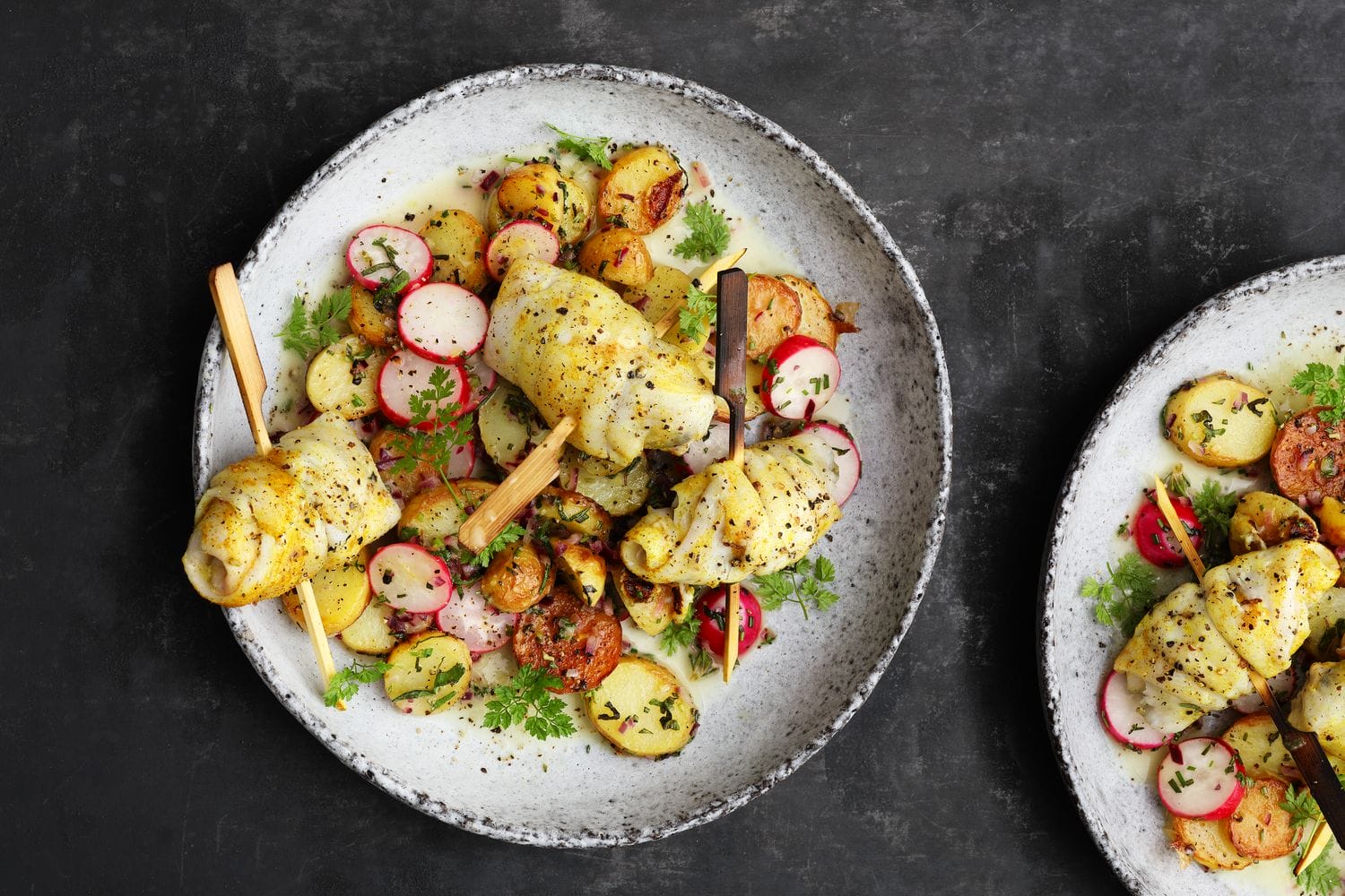 - Colocar los filetes uno al lado del otro y sazonar con curry, sal y pimienta. Coloque 2-3 filetes uno al lado del otro, enróllelos y ensártelos en una brocheta. Continúe hasta que tenga 4 rollos. Untar con aceite por ambos lados.