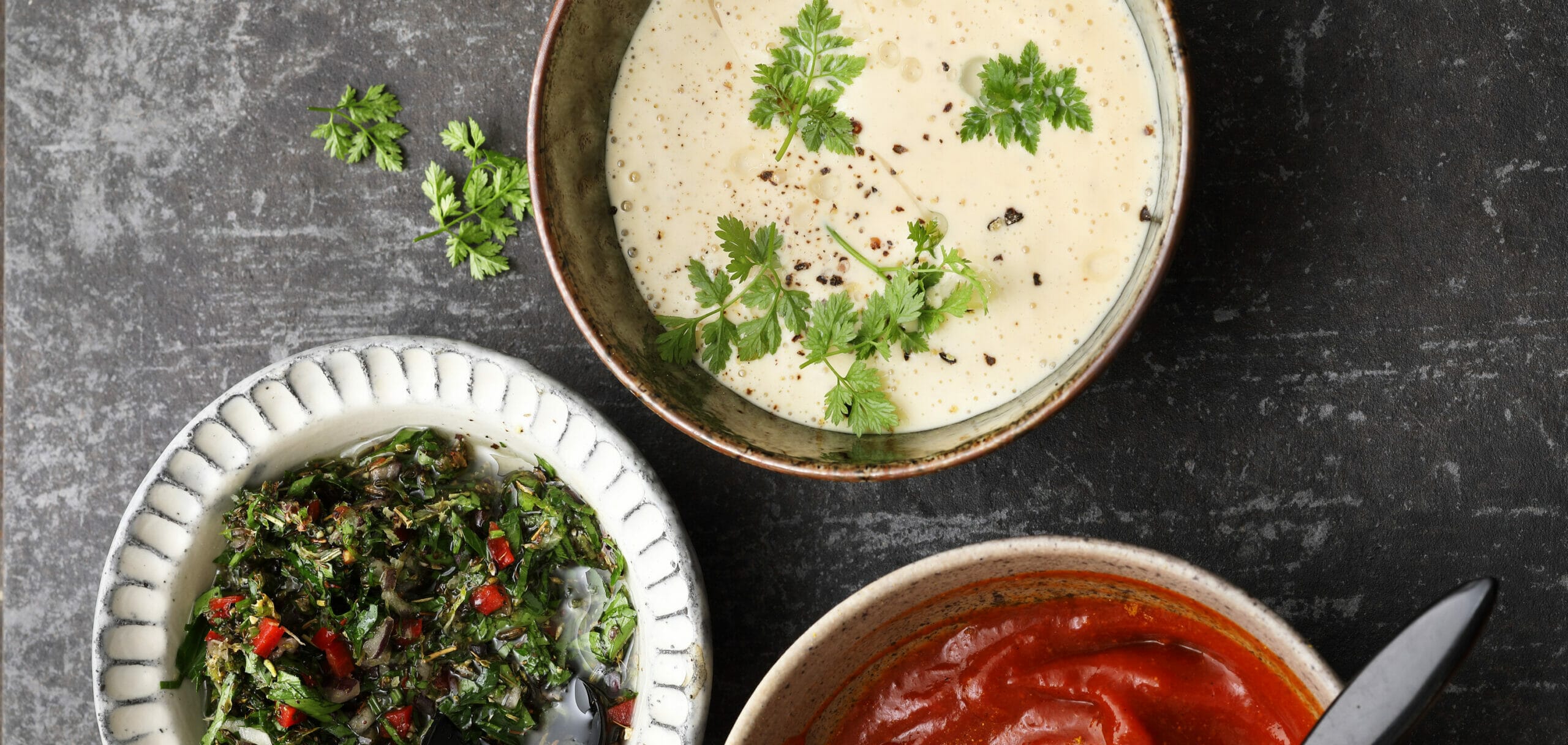 1. Pour la sauce du chef, éplucher l’ail et le couper grossièrement. Epépiner les poivrons et les couper grossièrement.