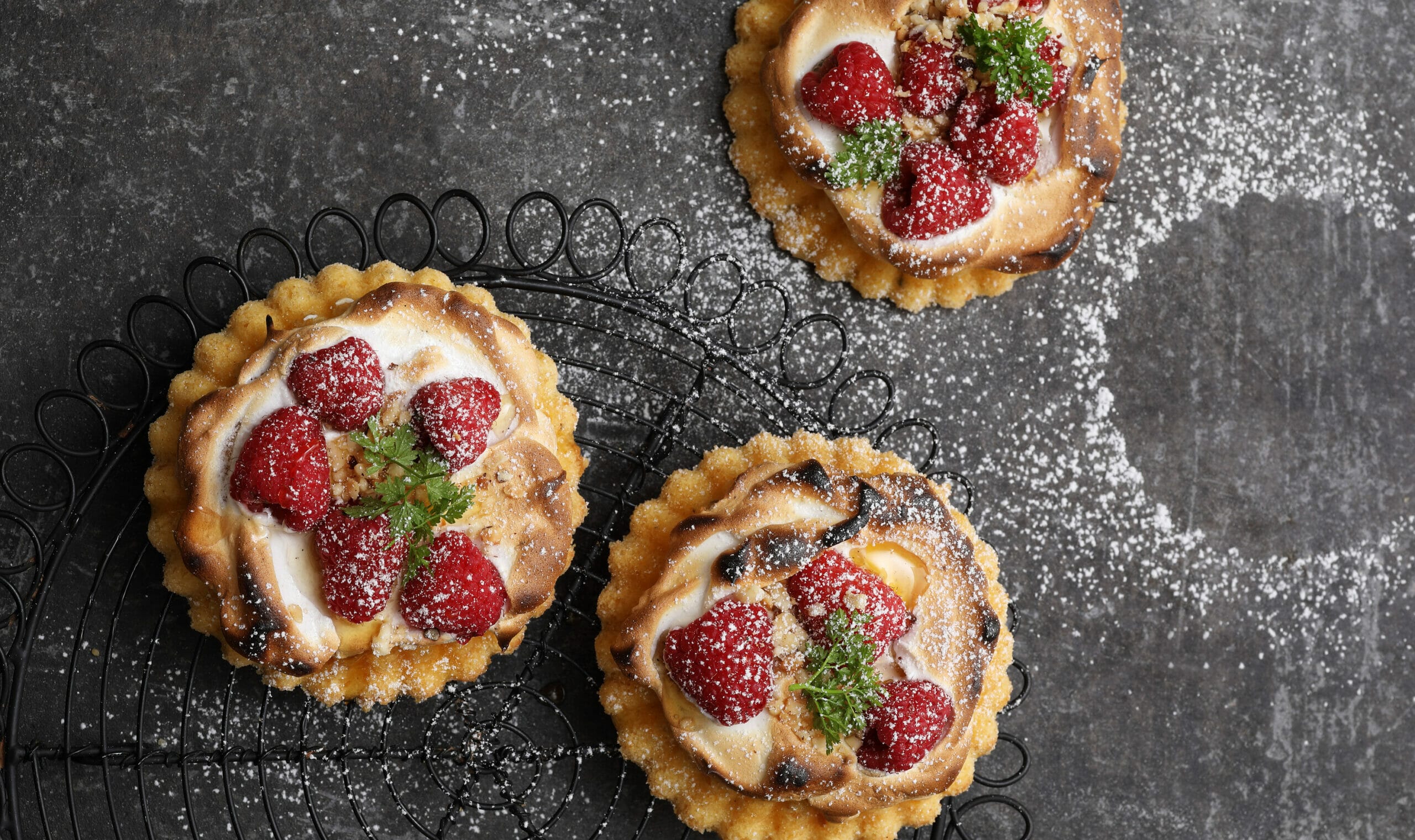 - Préchauffer le gril à 300 °C avec le couvercle fermé. Étaler la meringue sur les tartelettes avec le dos d’une cuillère et garnir de framboises, de miel et de noisettes hachées. Terminer ensuite la cuisson au gril pendant 1 à 2 minutes et saupoudrer de sucre glace.