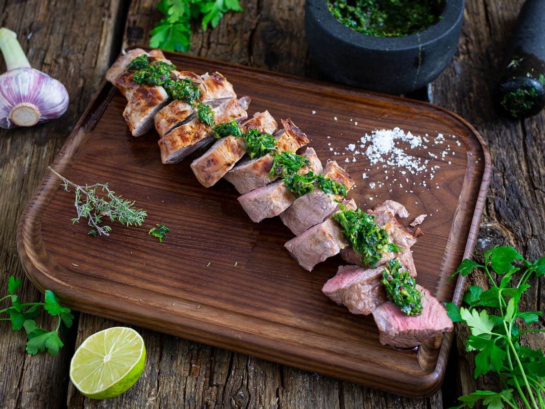 La viande est grillée à point. Le pain grillé est prêt. Il ne manque plus qu'une chose : la sauce. C'est précisément le sujet de cette recette et bien sûr, je veux te proposer quelque chose de spécial cette fois encore. Le chimichurri - la sauce argentine aux herbes - accompagne parfaitement la viande de bœuf grillée ou les steaks. Dans cette recette, elle est servie sur un délicieux filet de porc. Cette sauce semblable au pesto est également très utilisée comme marinade pour le poulet et le poisson.