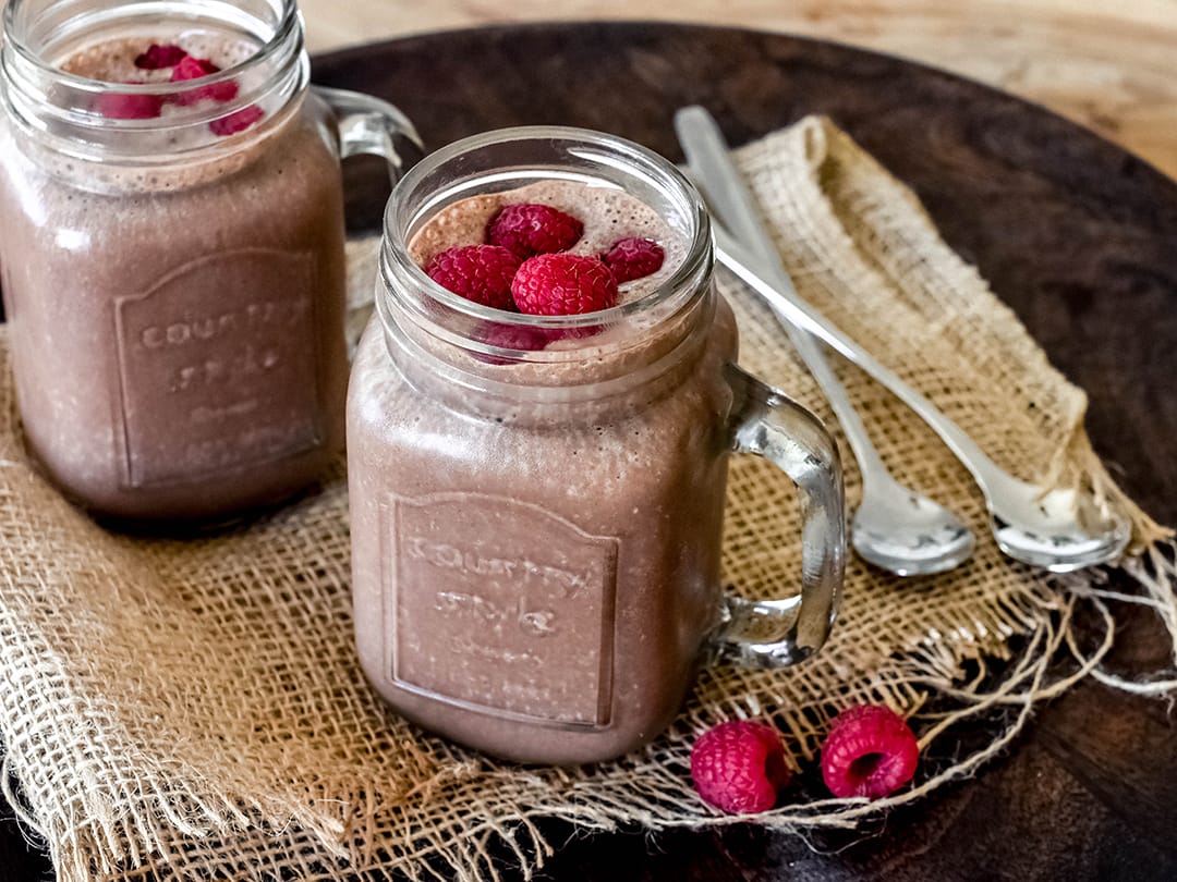 2. Transvaser le smoothie dans deux verres et garnir de framboises.