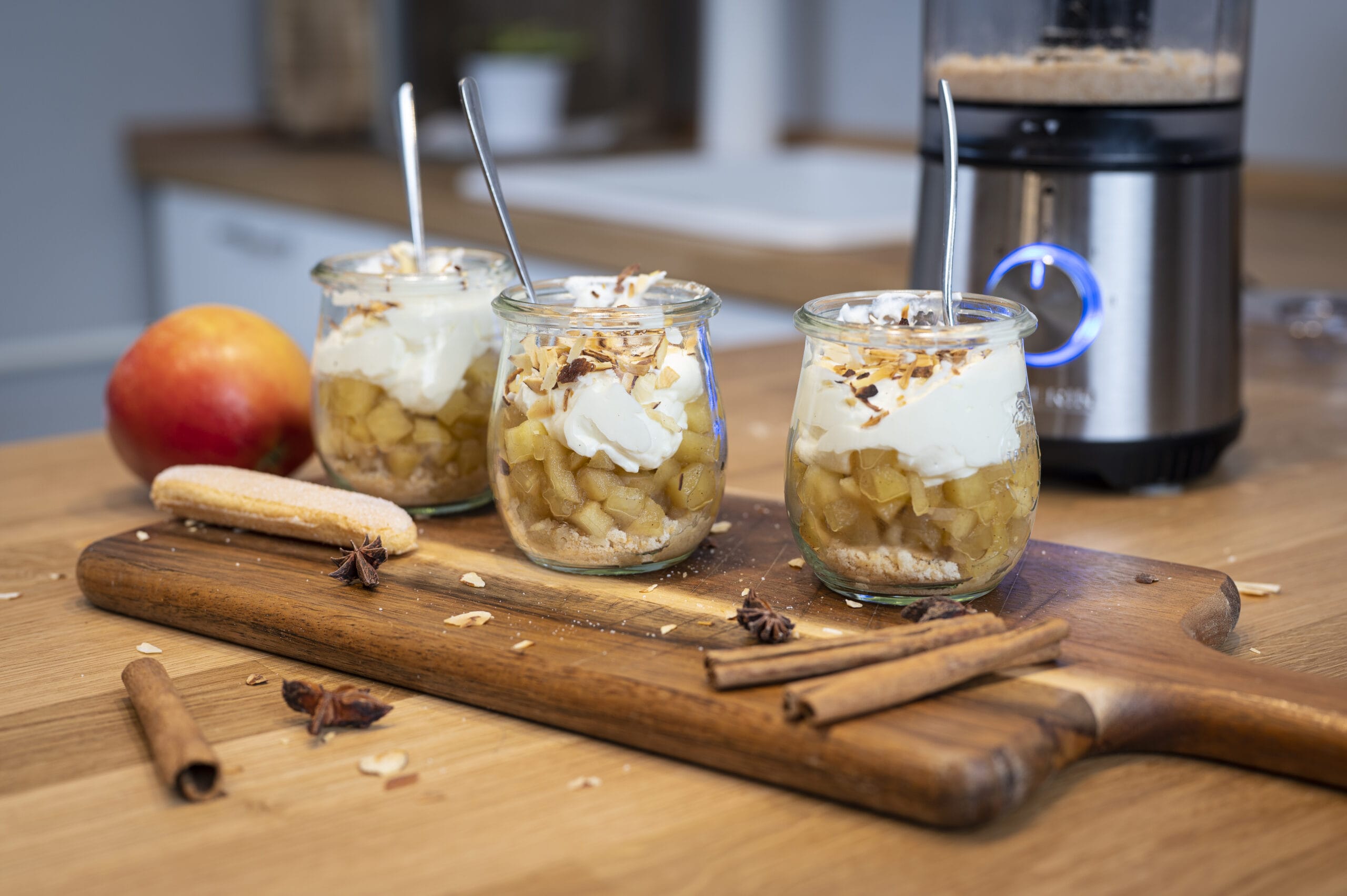 Pour la saison, nous vous proposons un tiramisu aux pommes au four et à la cannelle. Il convainc par sa crème moelleuse associée à des pommes douces et acidulées.