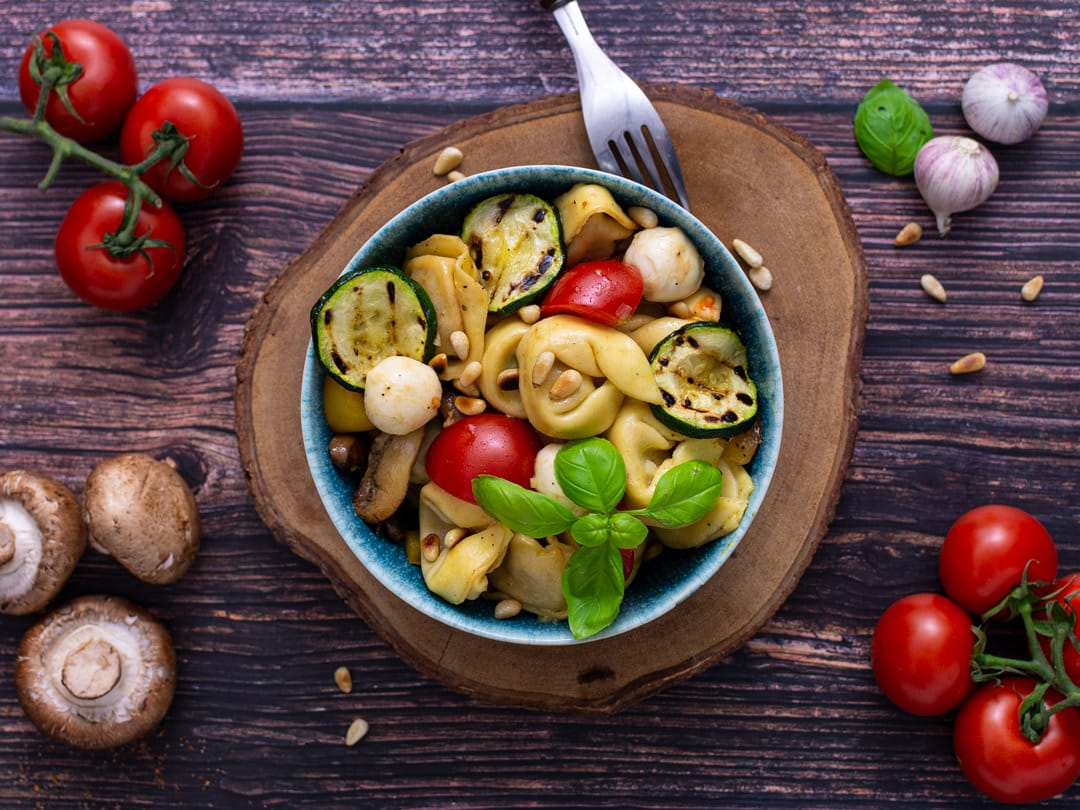 Perfetta per un picnic, un buffet di grigliate in giardino o un brunch: l'insalata di tortellini italiani. Verdure fresche, mozzarella, pinoli tostati e basilico aromatico completano perfettamente l'insalata. Servite con un semplice condimento a base di aceto balsamico e olio d'oliva. Qui potete vedere come preparare questa insalata in modo semplice e veloce.