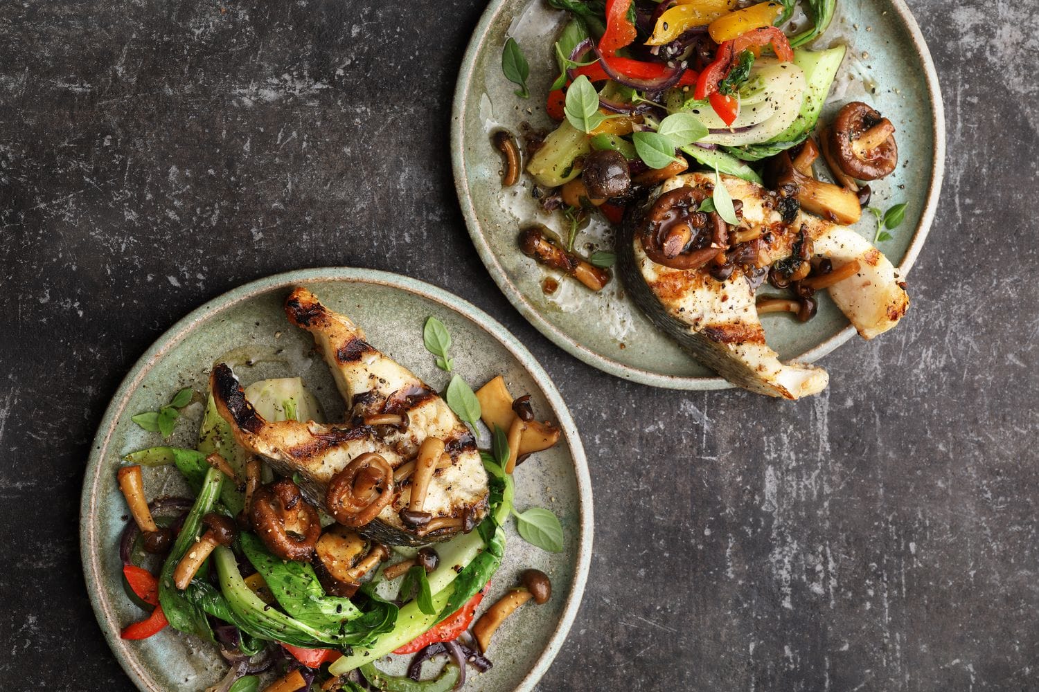 Branzino alla griglia con verdure pak choi e funghi teriyaki