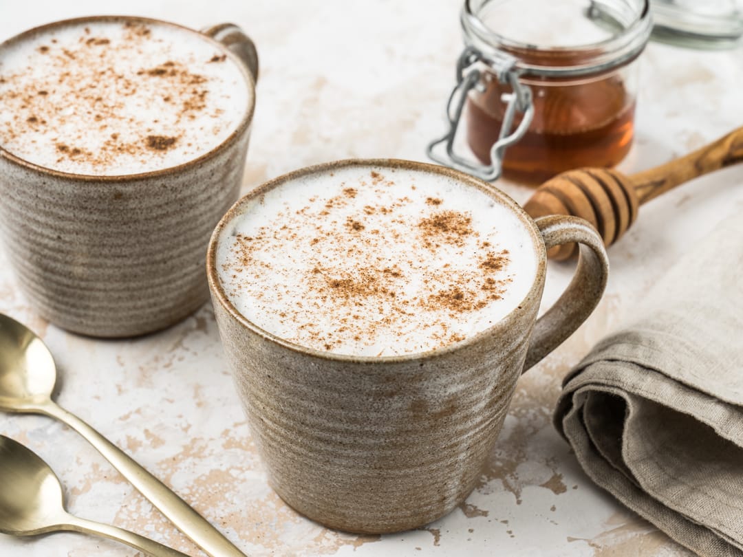 - Dividere il tè tra 2 tazze e mescolare ½ cucchiaio di miele in ciascuna di esse. Distribuire la schiuma di latte su entrambe le tazze e guarnire con cannella in polvere.
