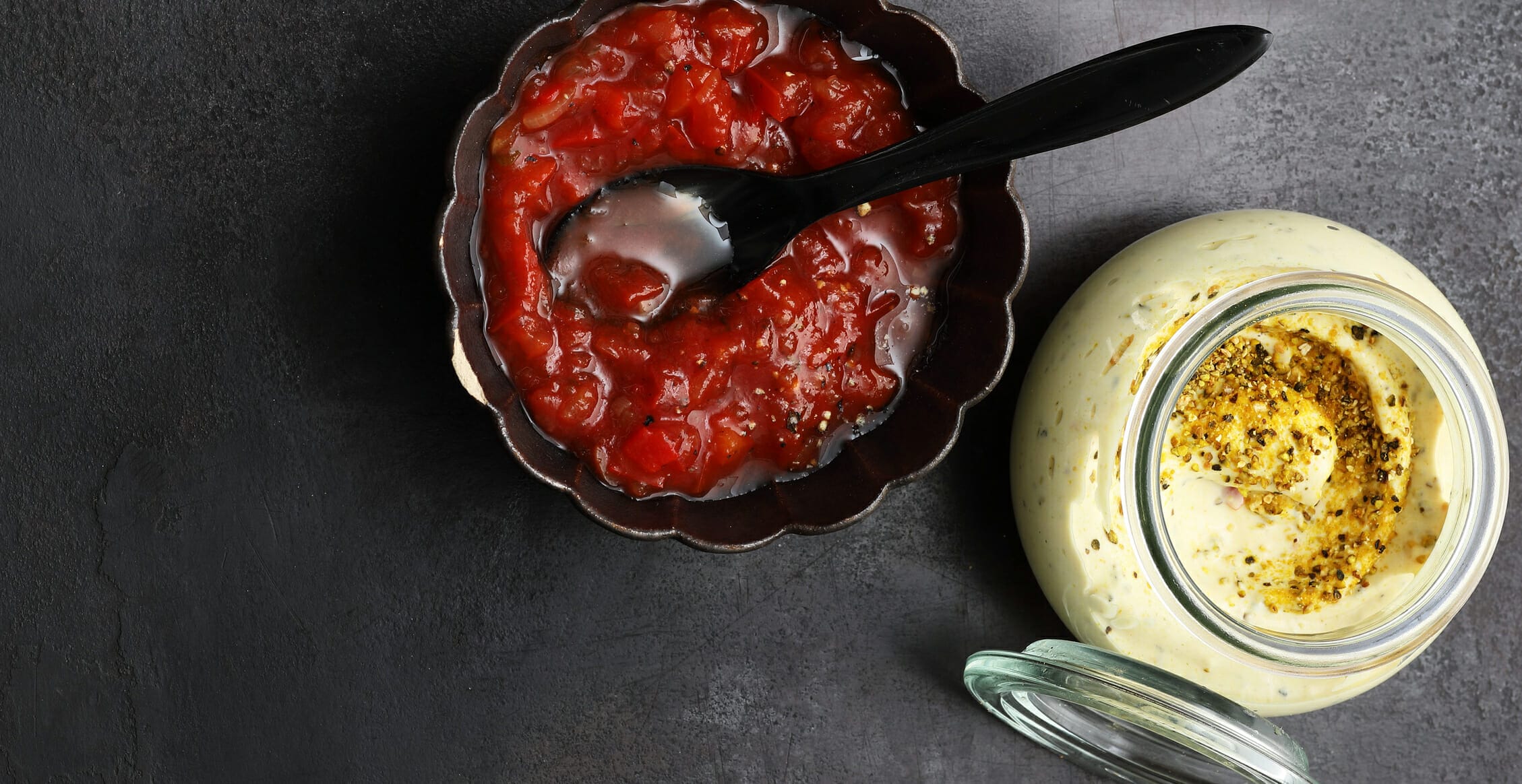 2. Doe de mosterd, honing, chilisaus, citroenpeper en het ei in een blenderkan.