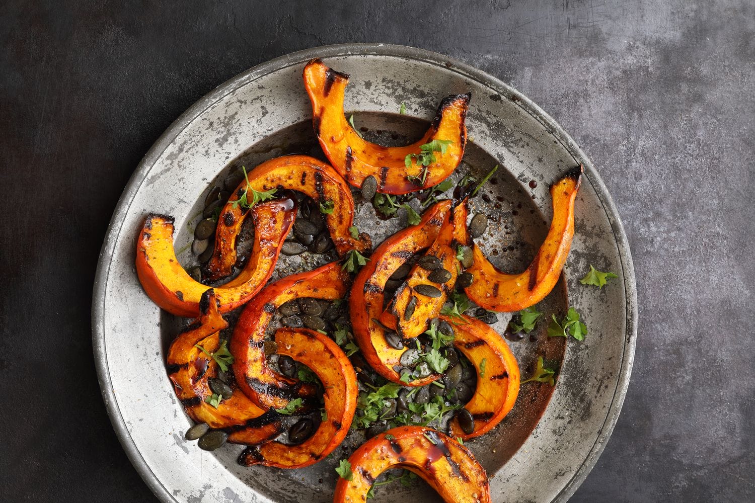 - Ułóż grillowaną dynię na półmisku i posyp natką pietruszki, pestkami dyni i polej olejem z pestek dyni.