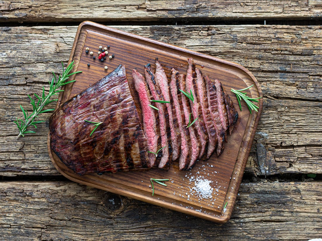- Odstawić stek na desce do krojenia na 5 minut. Podawać pokrojony w cienkie plastry w kierunku przeciwnym do włókien.